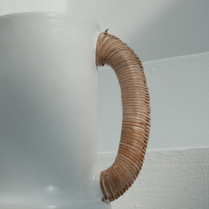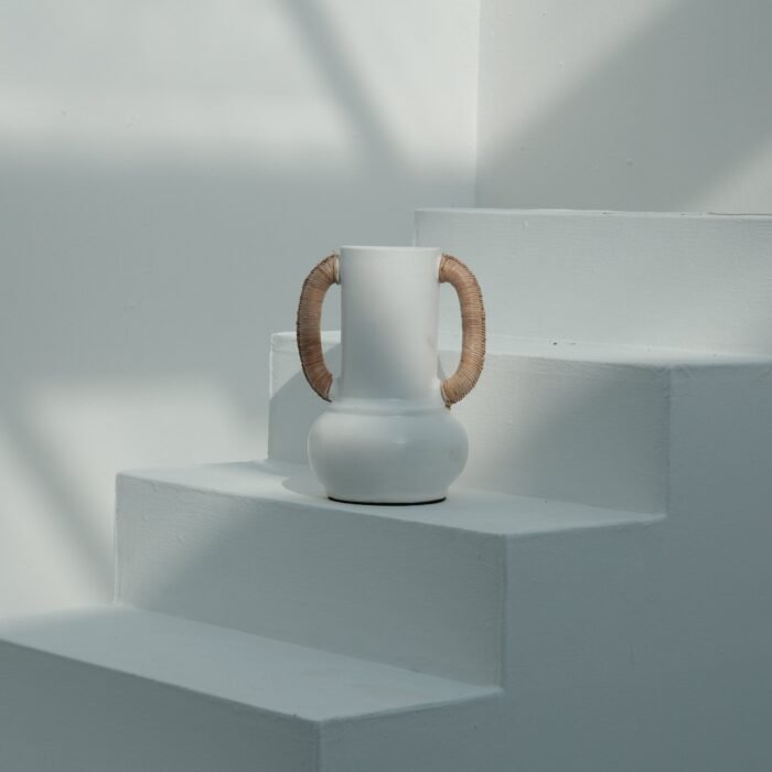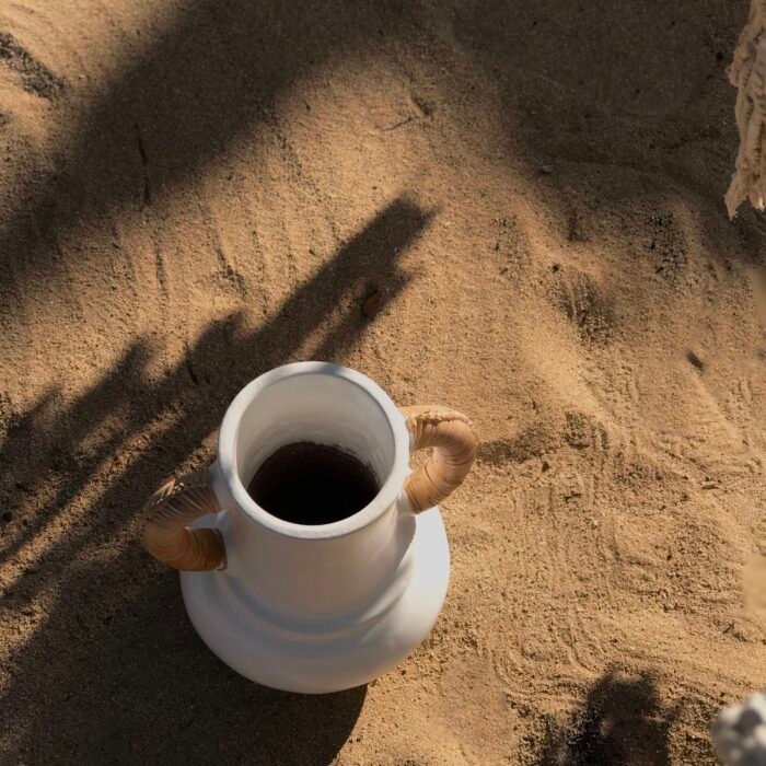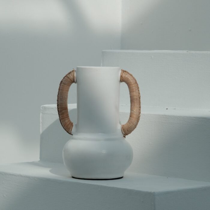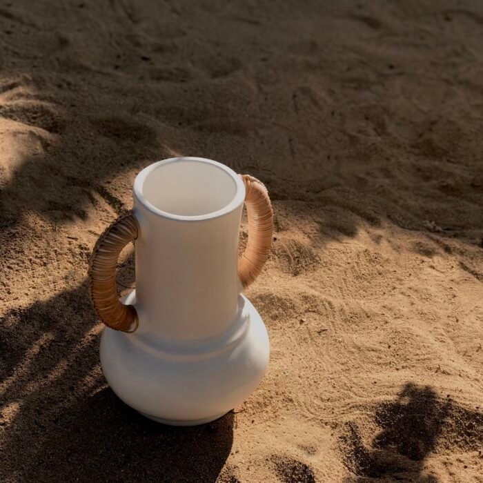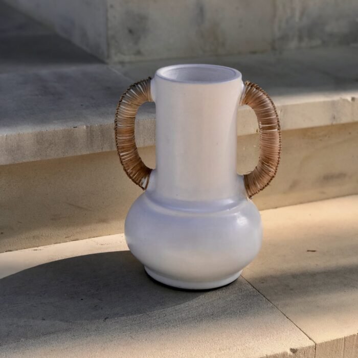 Each Adora Vase is hand-thrown by skilled artisans and finished with carefully woven rattan handles. Subtle variations in shape and finish are a hallmark of its handcrafted nature, ensuring no two are exactly alike