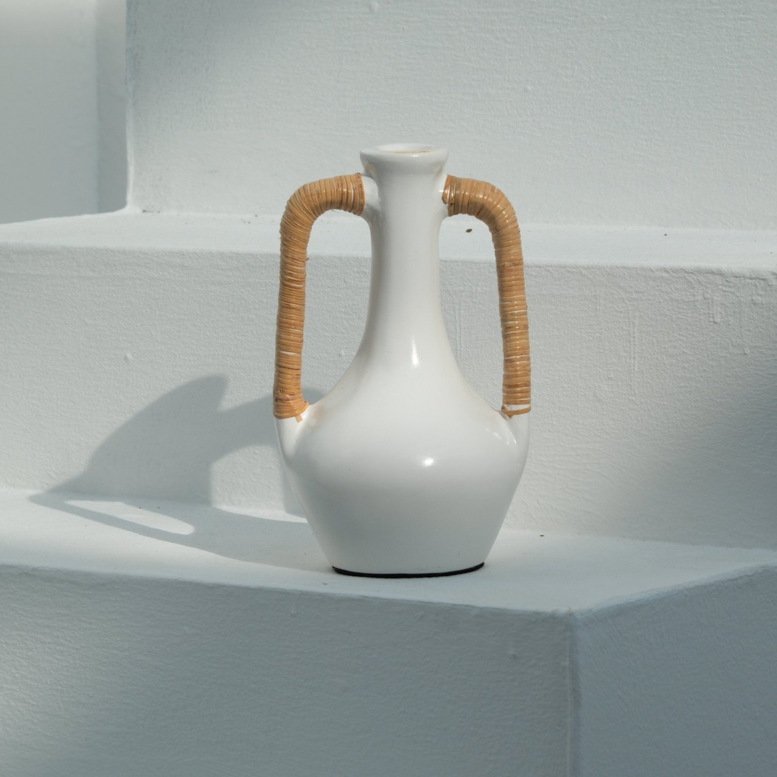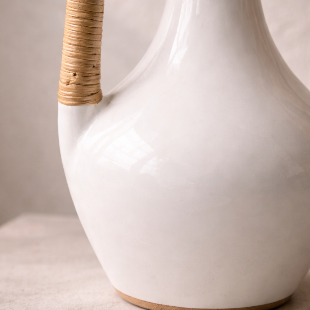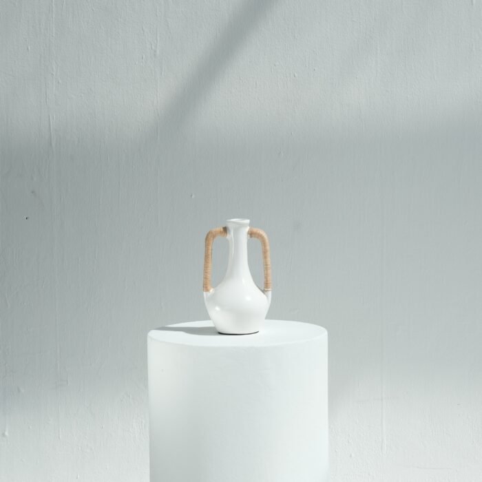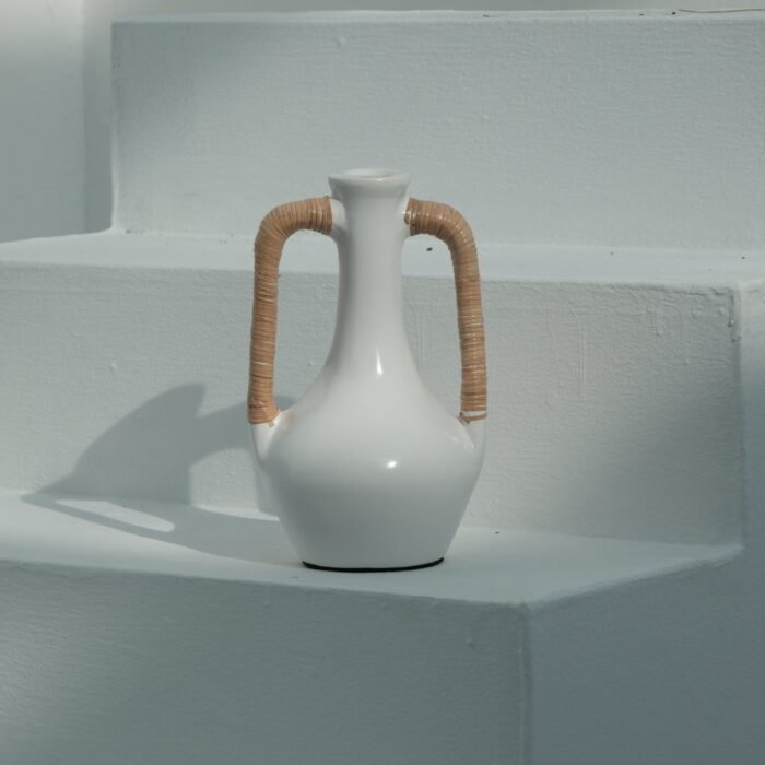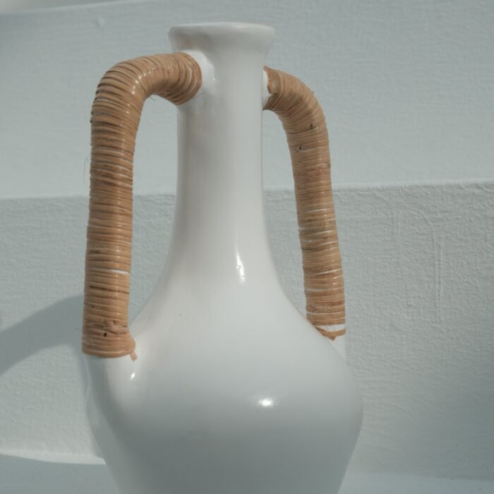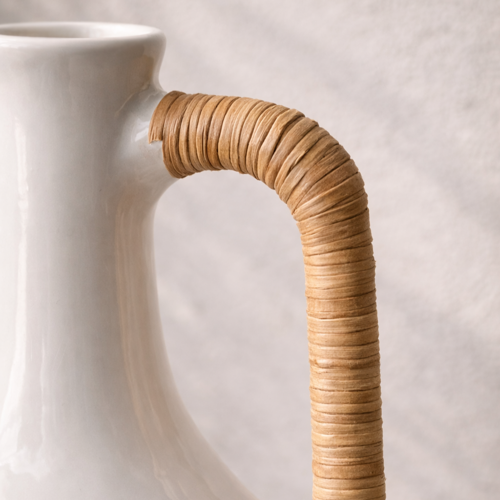 Each Olie Vase is hand-thrown by skilled artisans and finished with carefully woven rattan handles. Subtle variations in shape and finish are a hallmark of its handcrafted nature, ensuring no two are exactly alike