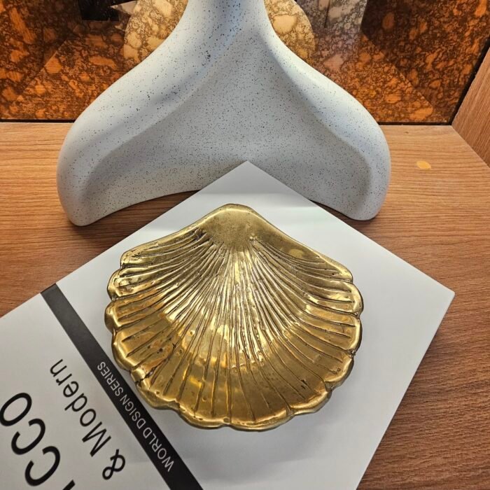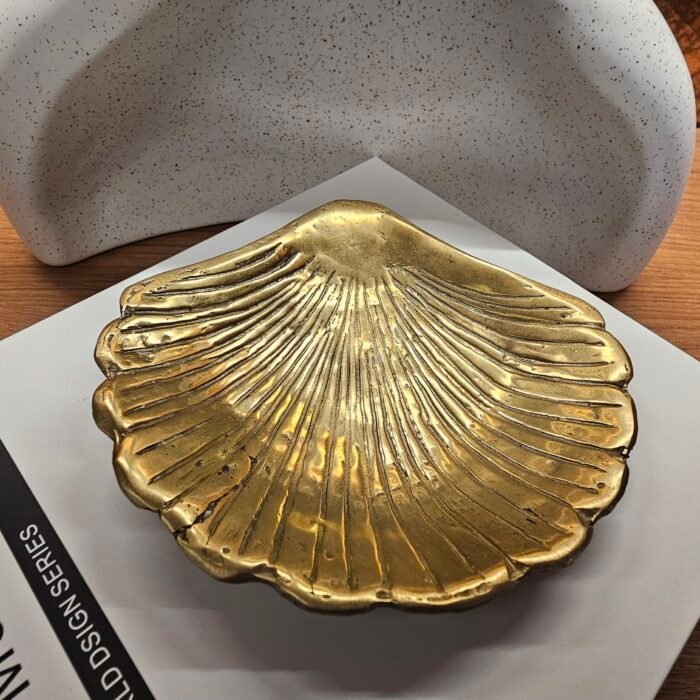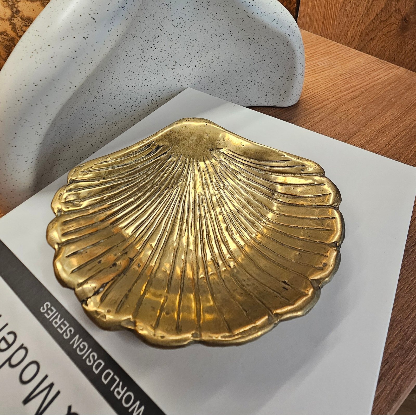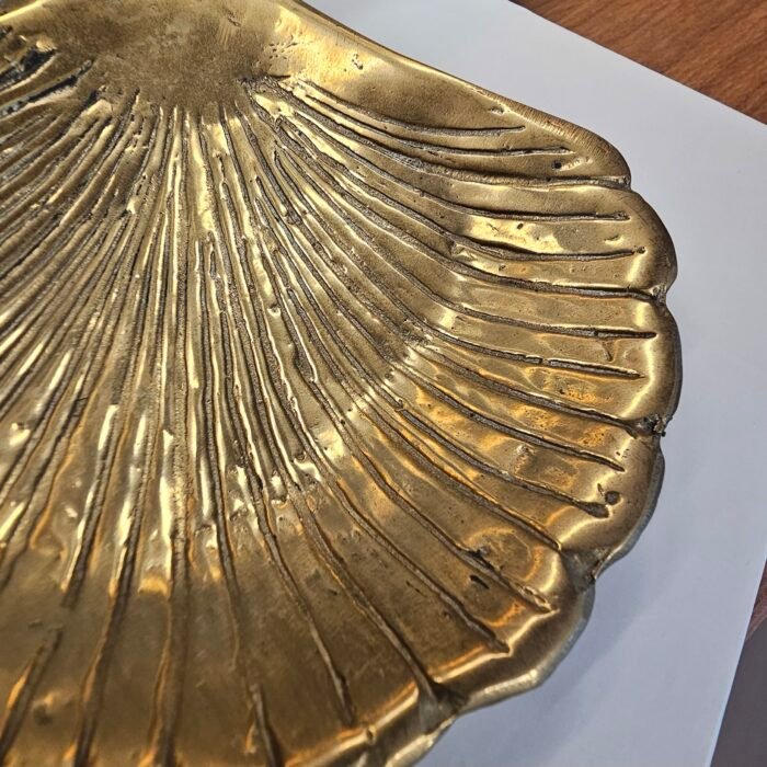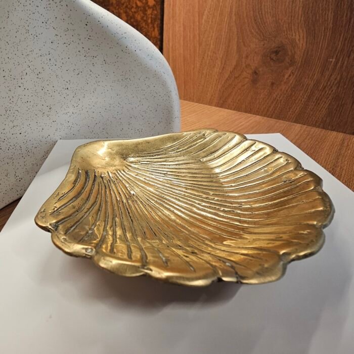 A brass clamshell tray is a decorative tray made from brass in the shape of a clamshell. It is designed to resemble the shell of a clam, with the outer surface usually featuring intricate detailing to mimic the texture and shape of the shell. The tray is typically used as a display piece or for serving small items such as jewellery, trinkets, or even snacks
