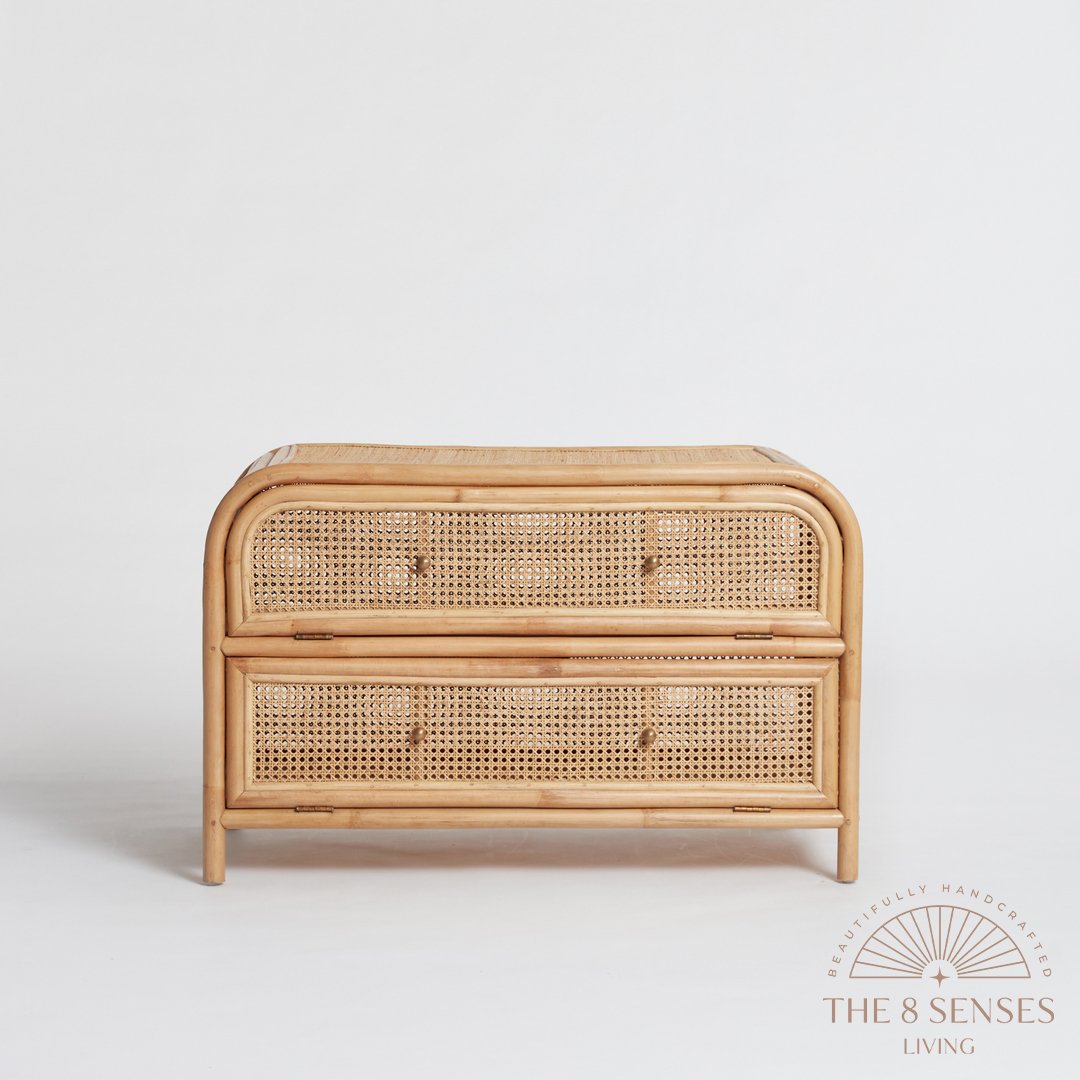 Finely sanded finish, this high-grade sustainable 100% natural rattan sideboard is unique in structure with curved ends. The elegant Gina sideboard is a gorgeous addition to your loungeroom, dining, or entryway. With its two doors that allow easy access, the cabinet offers ample storage