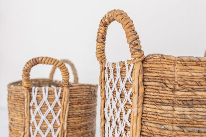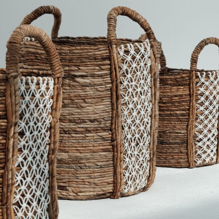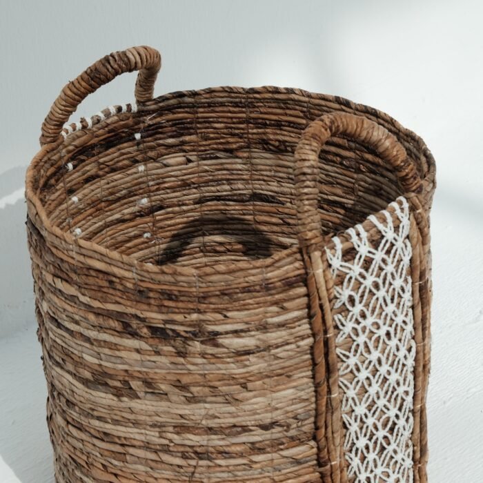 Handmade in Indonesia of 100% banana leaf, open-weave basket features macrame details