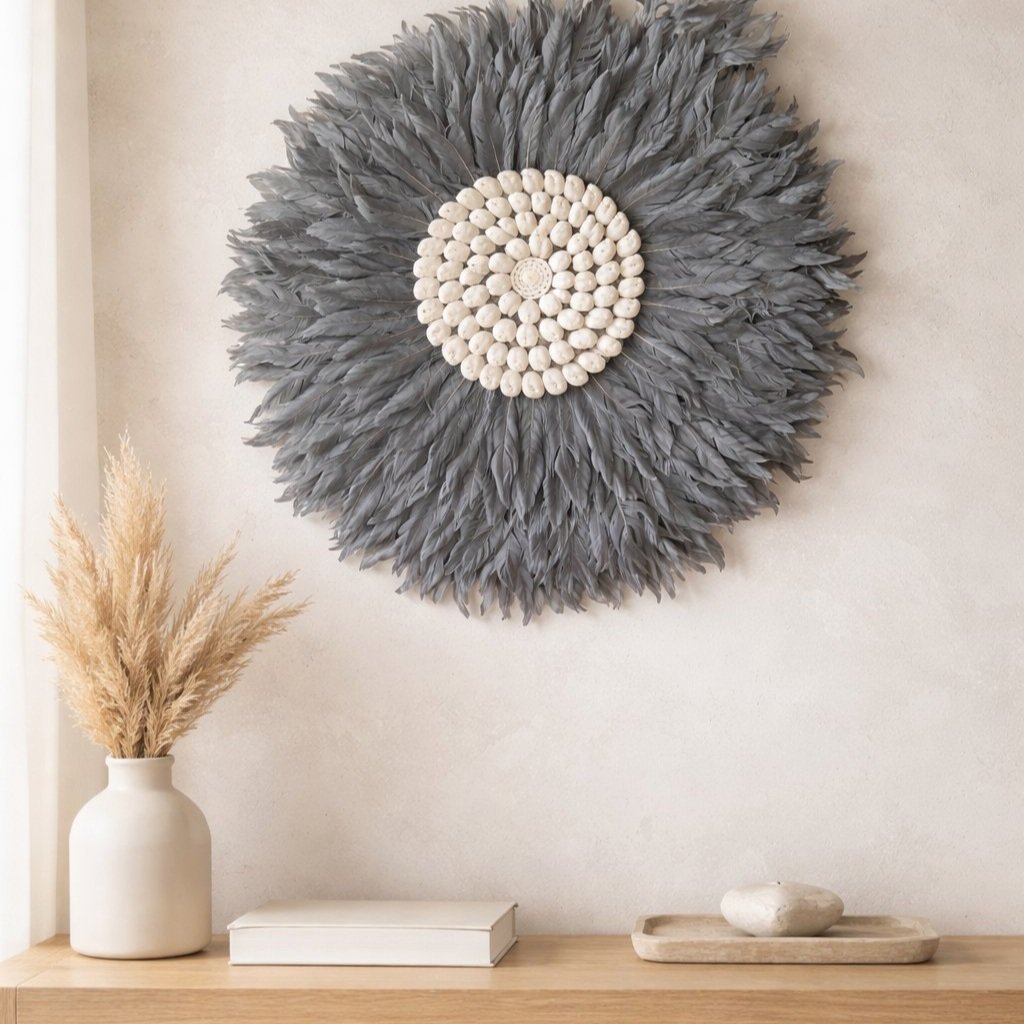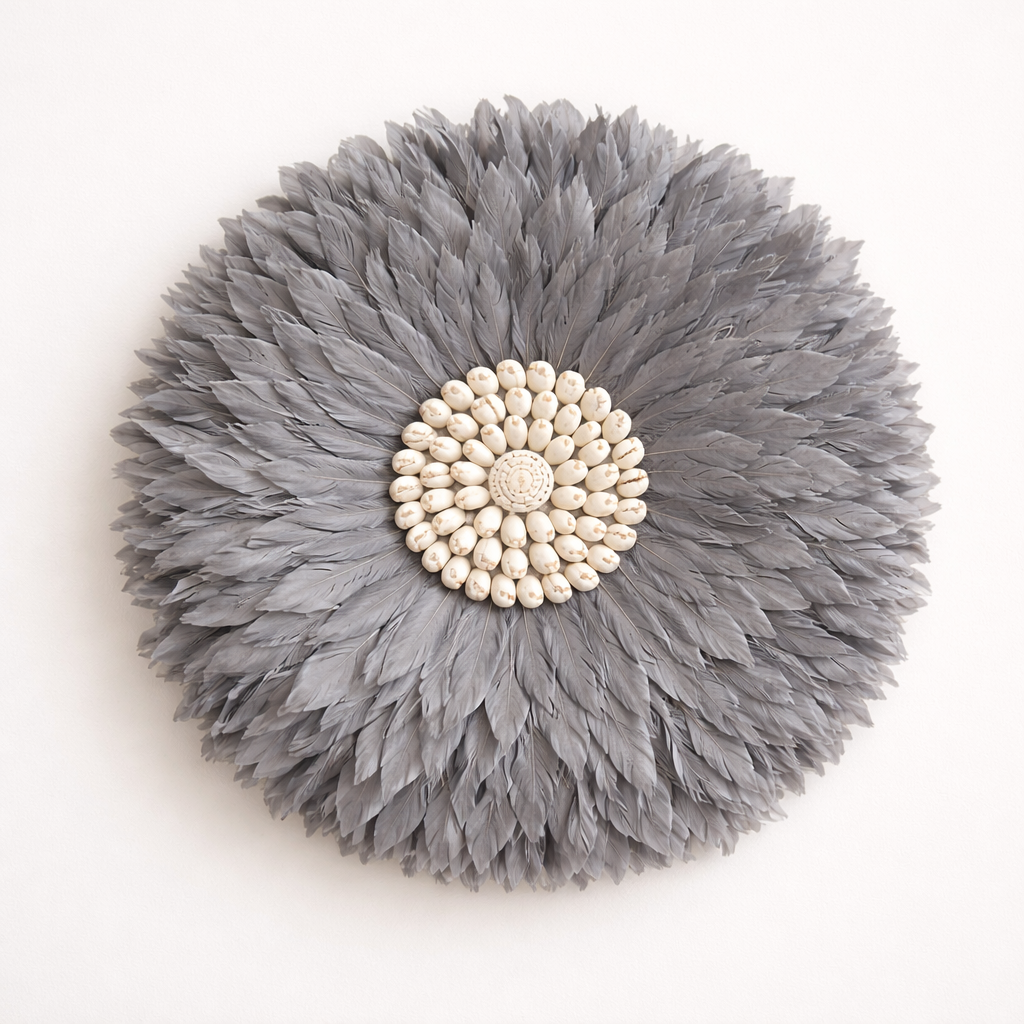 A timeless piece that embodies understated luxury. The soft grey feathers reflect light beautifully, creating an airy and serene ambiance, while the shell center adds an earthy, artisanal touch.