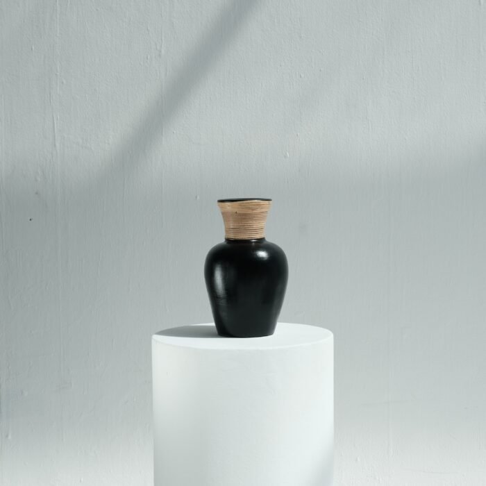 The Vanika Vase brings a soulful, organic touch to your home with its natural terracotta body and handcrafted rattan-wrapped neck. Its sculptural shape and earthy textures make it a striking accent—whether styled with dried florals or left as a statement on its own.