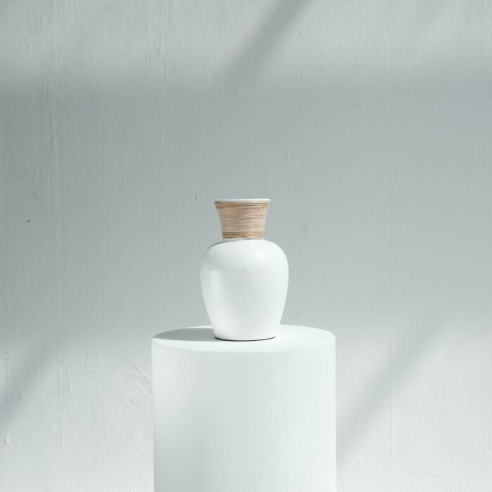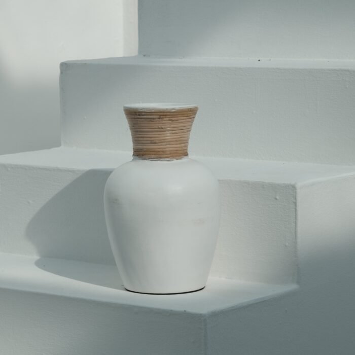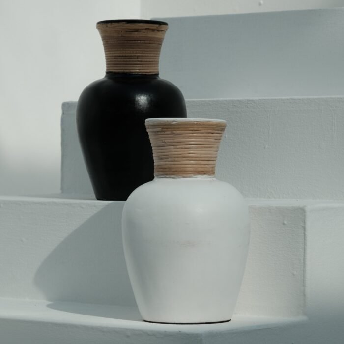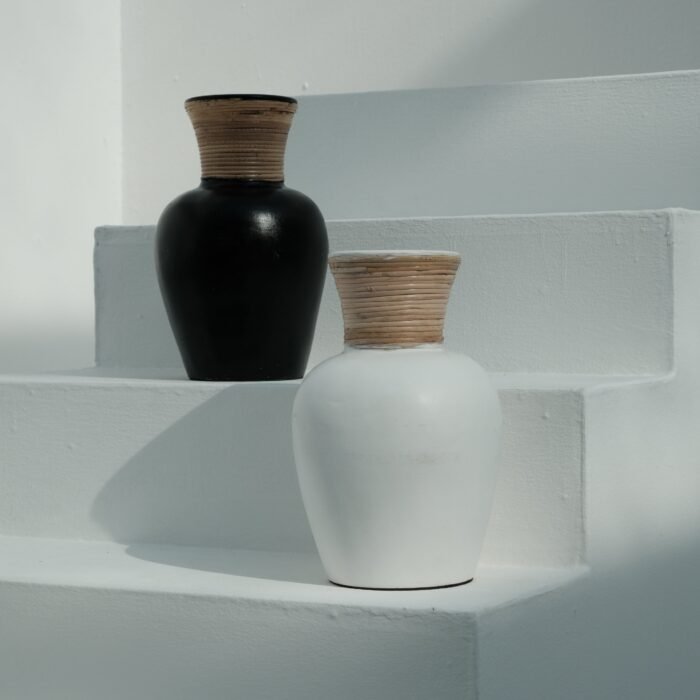 Each Vanika Vase is hand-thrown by skilled artisans and finished with carefully woven rattan handles. Subtle variations in shape and finish are a hallmark of its handcrafted nature, ensuring no two are exactly alike