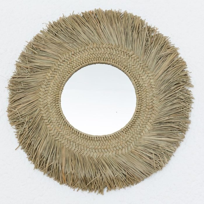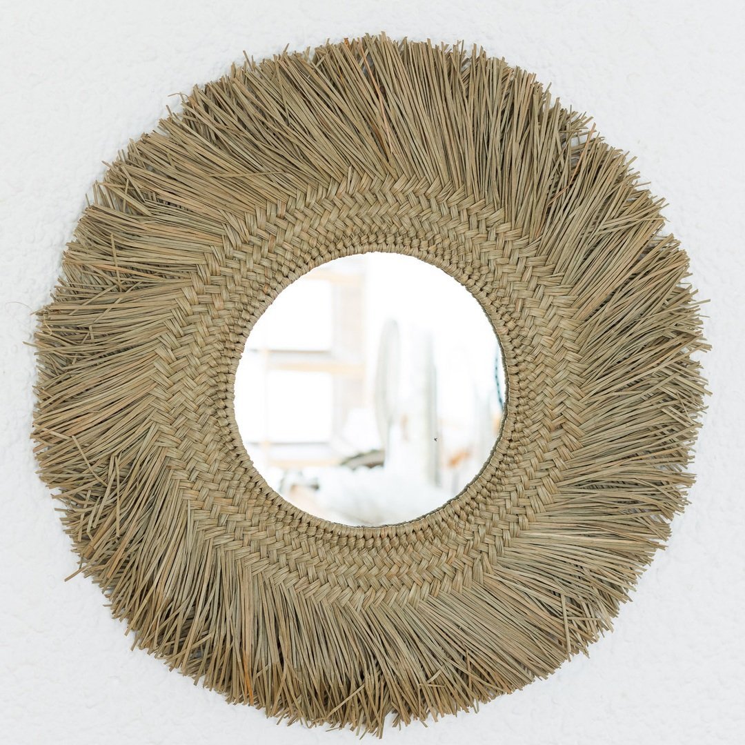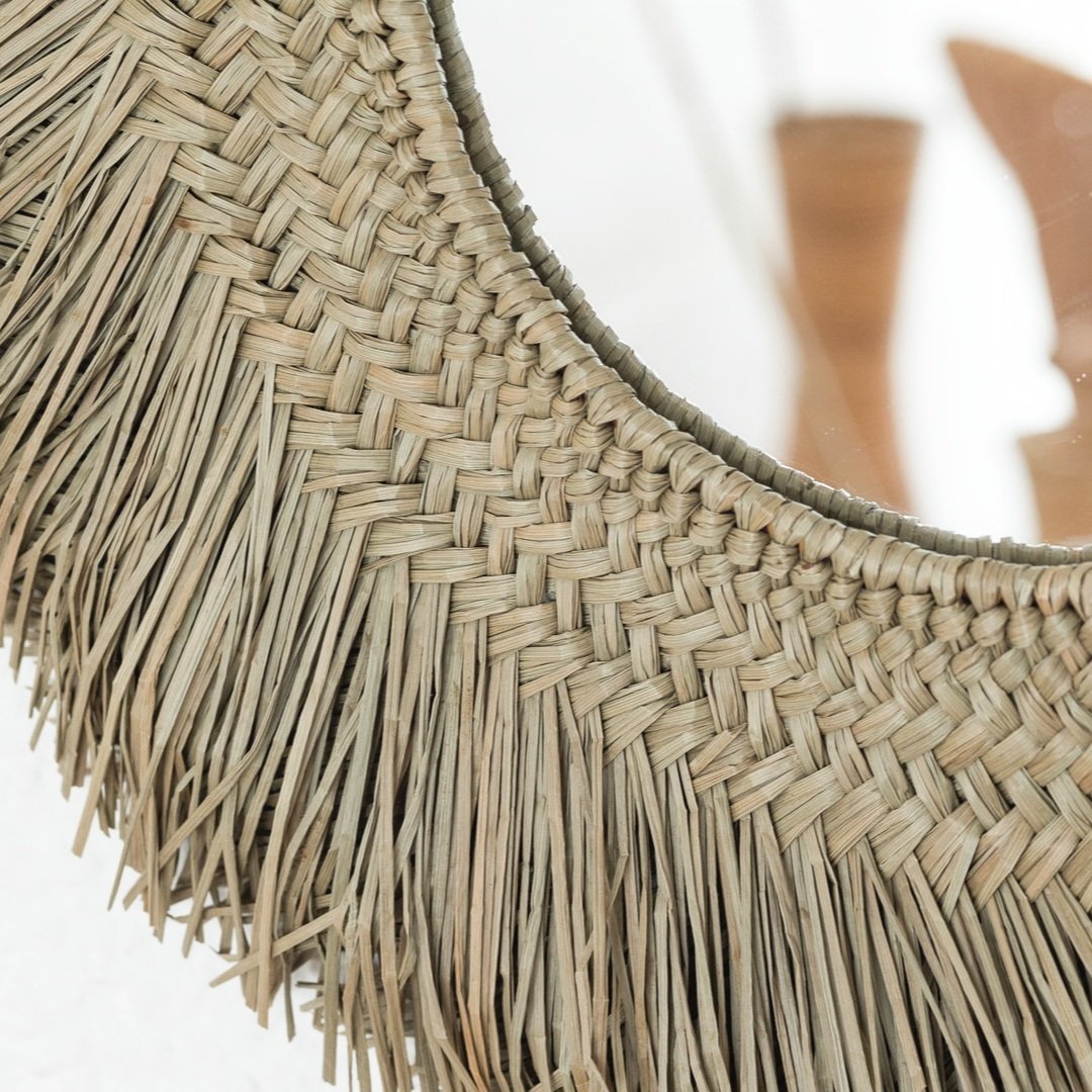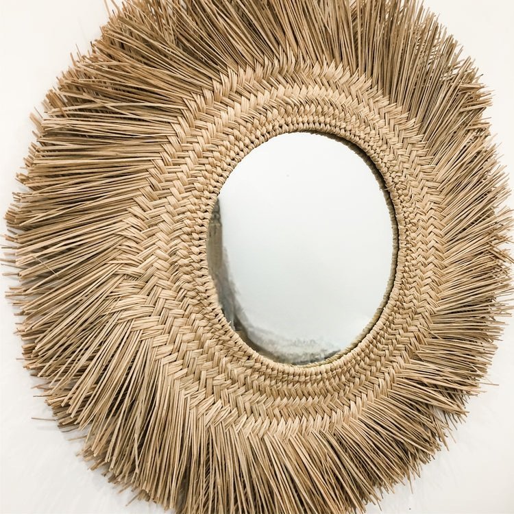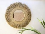 This bohemian mirror has been handmade using natural materials. Dry grass is carefully sewed and attached to metal to create this beautiful wall decor piece. Its versatility makes it ideal for any home decor from coastal to boho and rustic