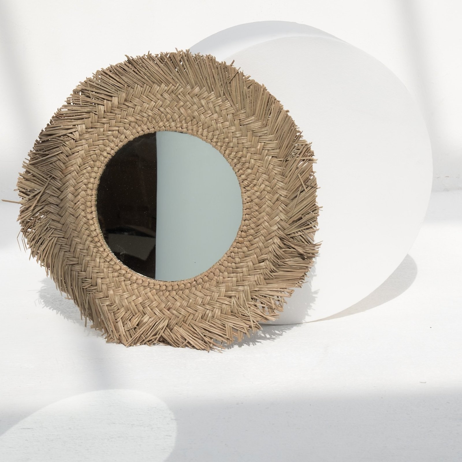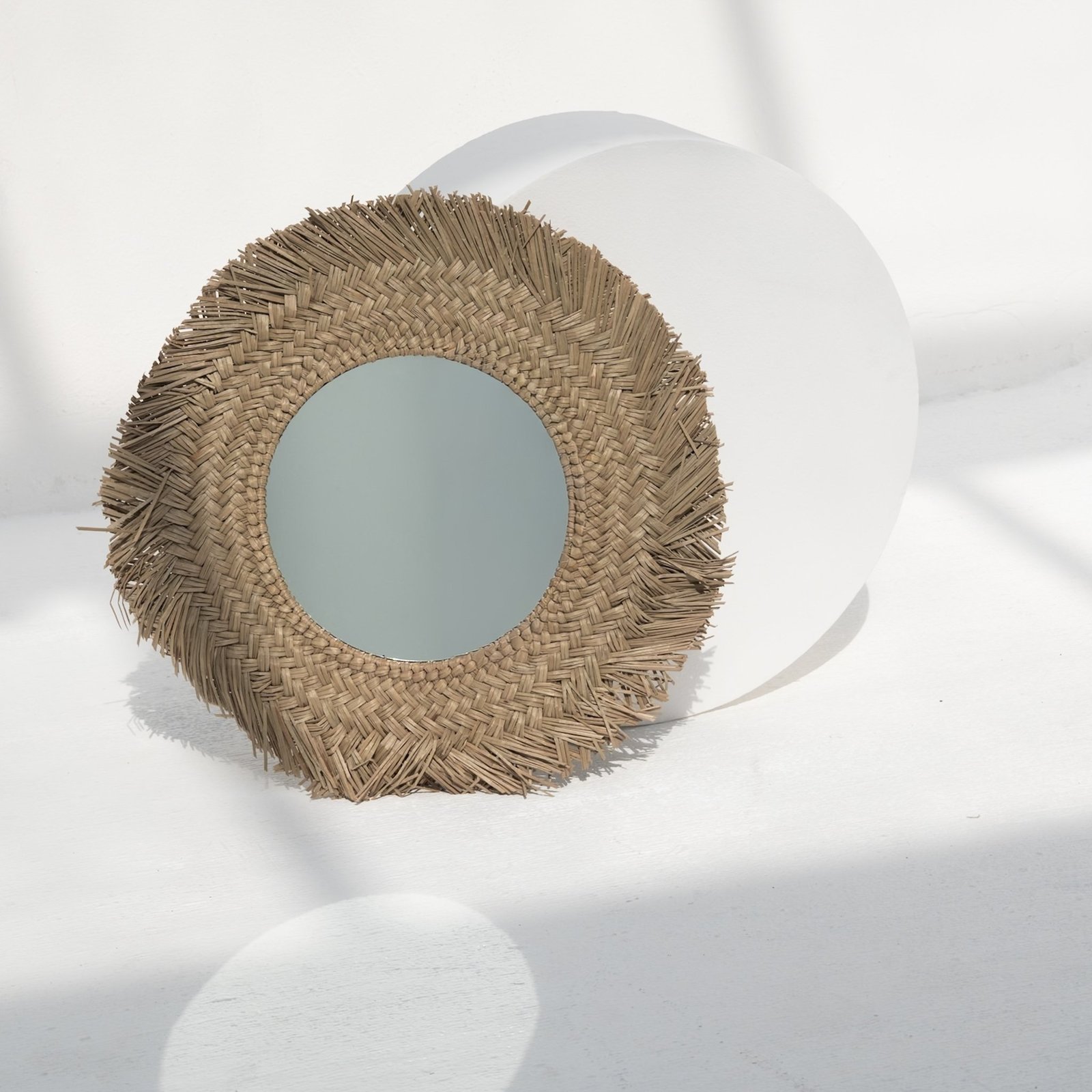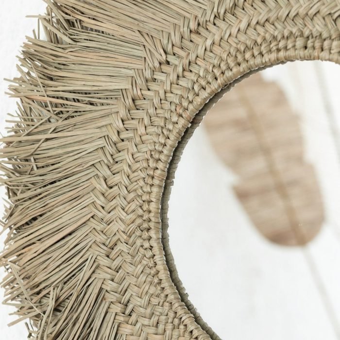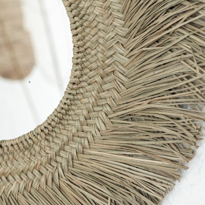 This bohemian mirror has been handmade using natural materials. Dry grass is carefully sewed and attached to metal to create this beautiful wall decor piece. Its versatility makes it ideal for any home decor from coastal to boho and rustic