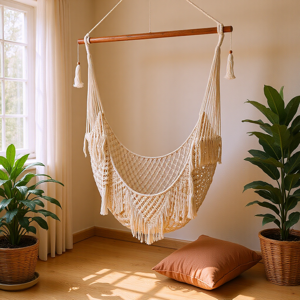 Relax in effortless island style with the handcrafted Macrame Hammock. Woven by skilled Balinese artisans from 100% natural cotton, its intricate macrame design and soft texture bring a touch of bohemian elegance to your home or outdoor retreat. Perfect for lounging in the garden, on the terrace, or inside a cozy reading nook, this hammock combines comfort, beauty, and artisanal charm.