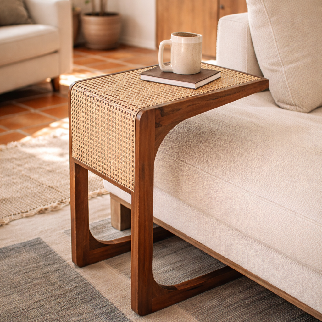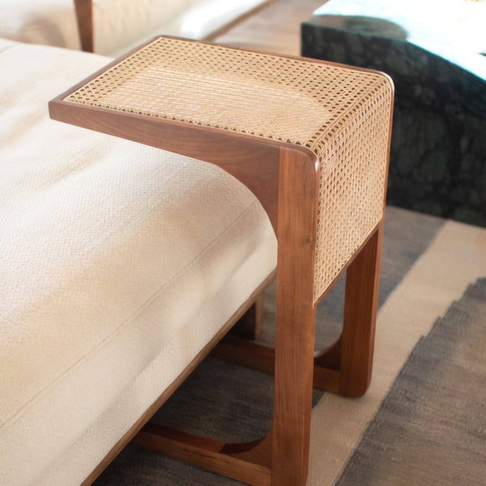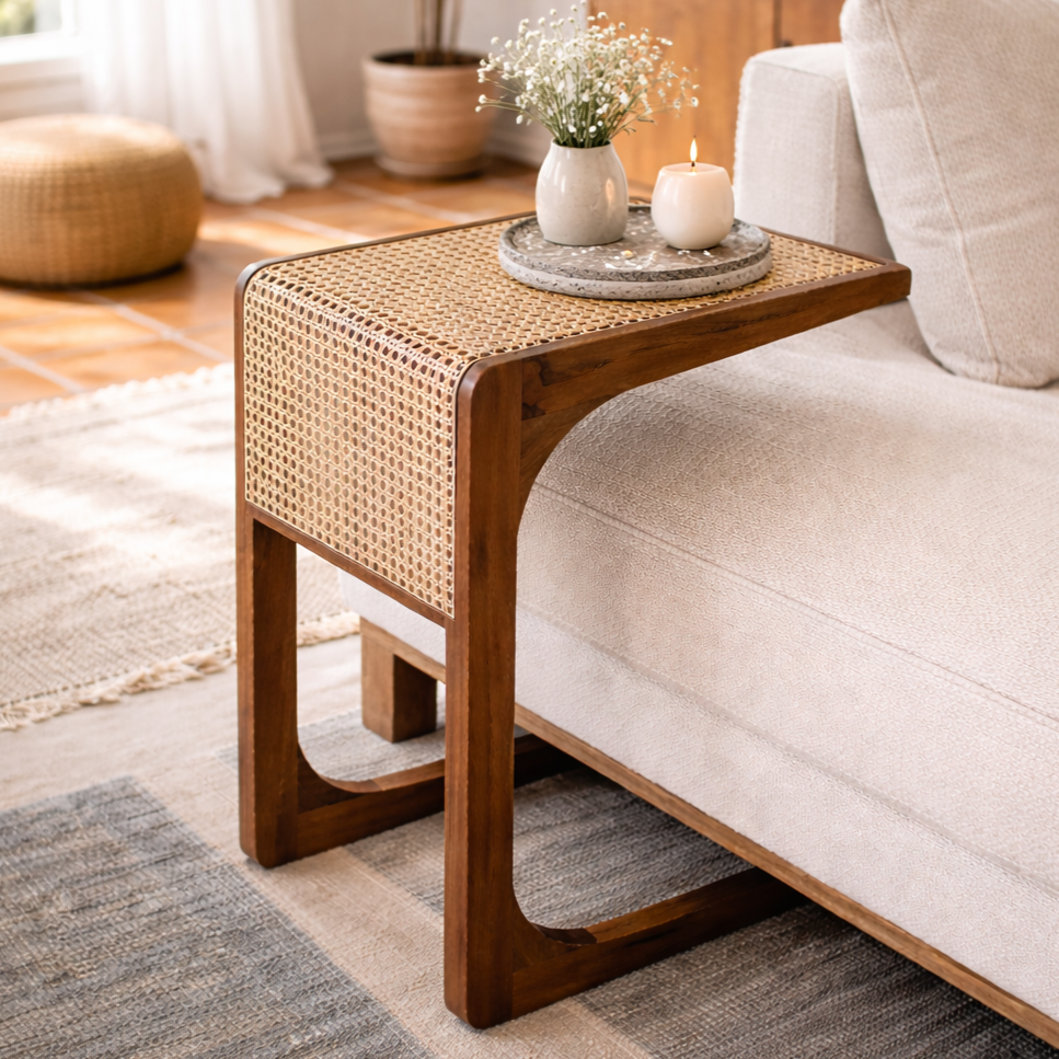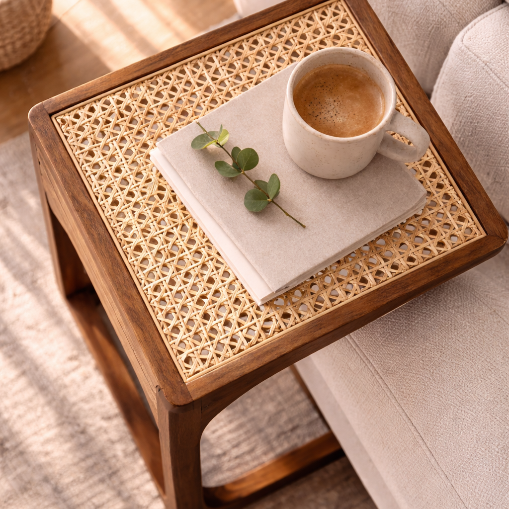 The Nisa Cane & Wood Side Table blends natural cane detailing with solid wood craftsmanship for a warm, timeless look. Its organic textures and clean silhouette make it a versatile accent—perfect beside a sofa, bed, or reading corner.