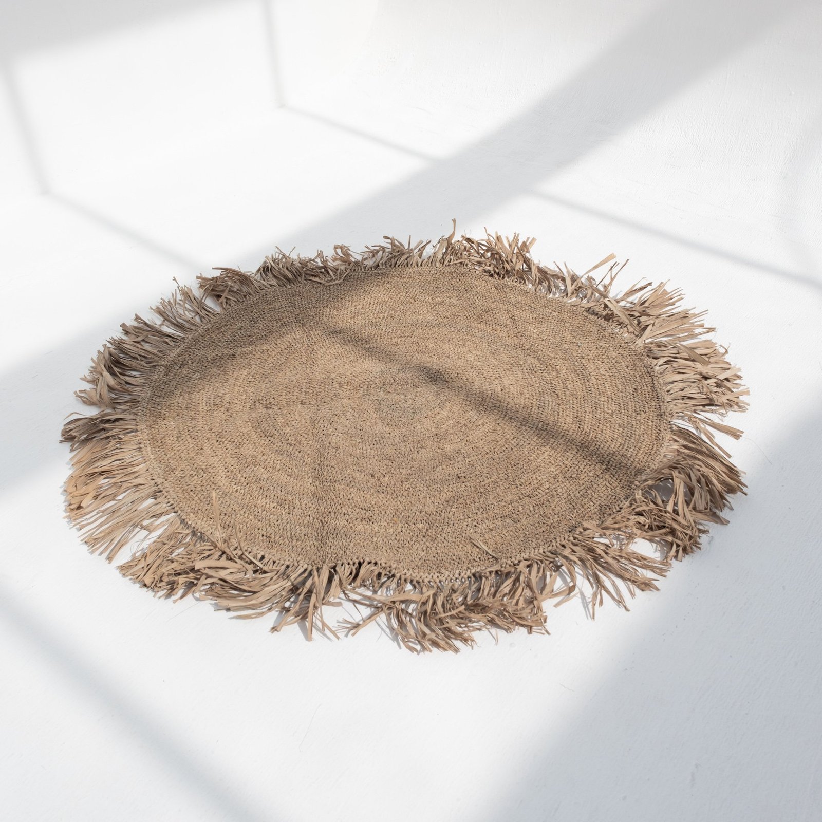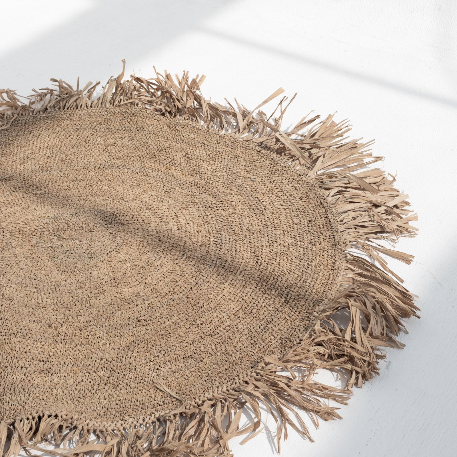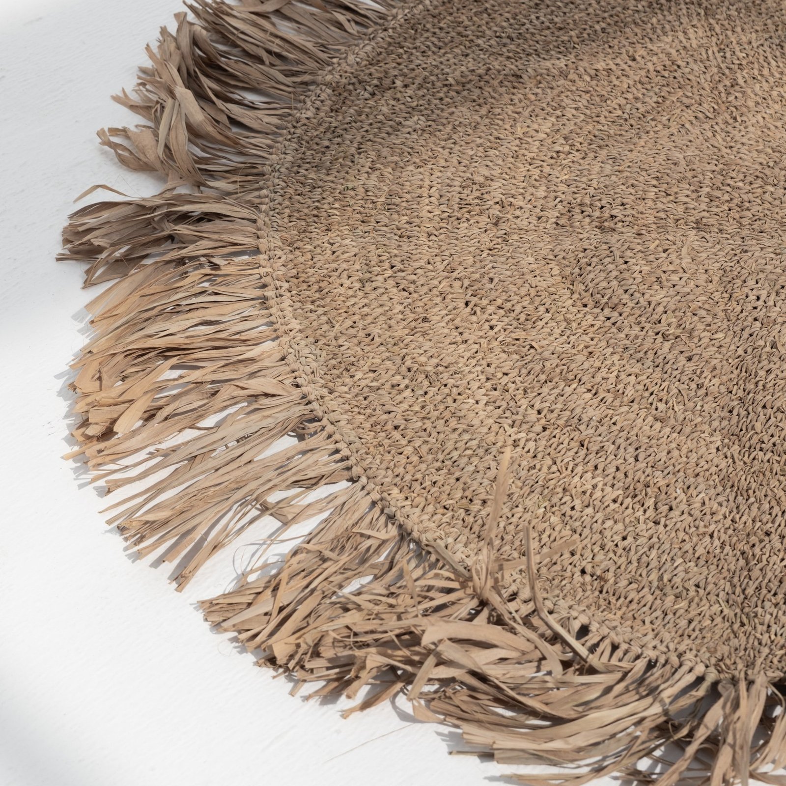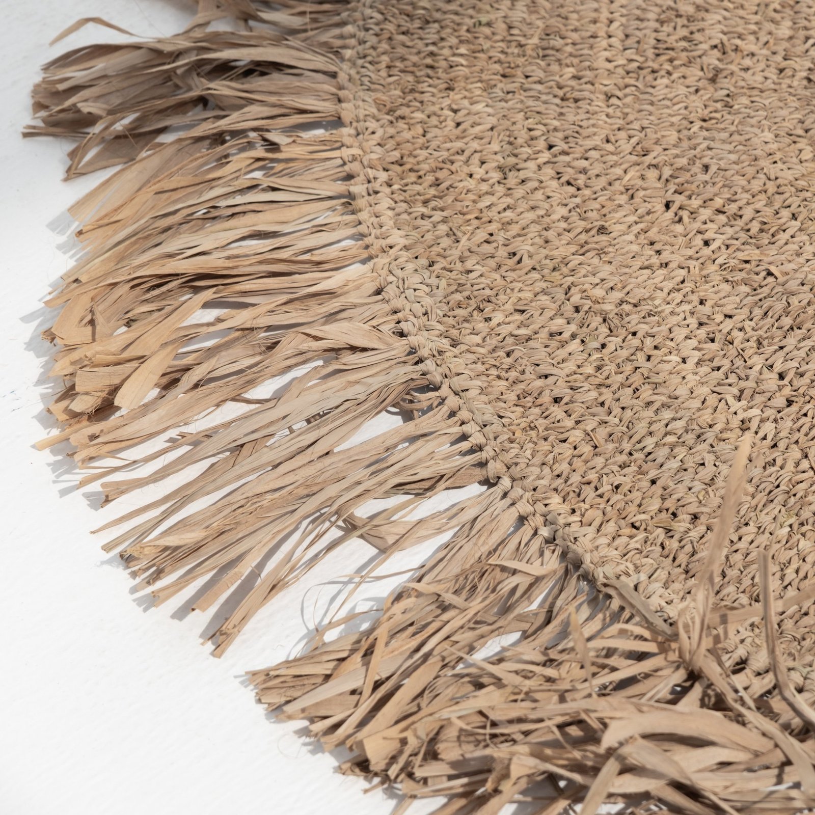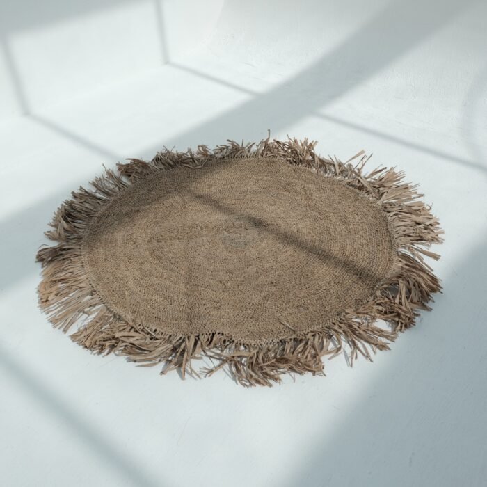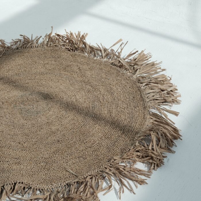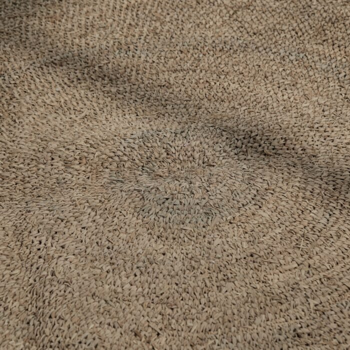 Our gorgeous natural rug is made of raffia. This material is a perfect alternative to artificial fibers and is water resistant. These grass-like leaves are durable, and when woven together, create the texturally rich and aesthetically beautiful rugs