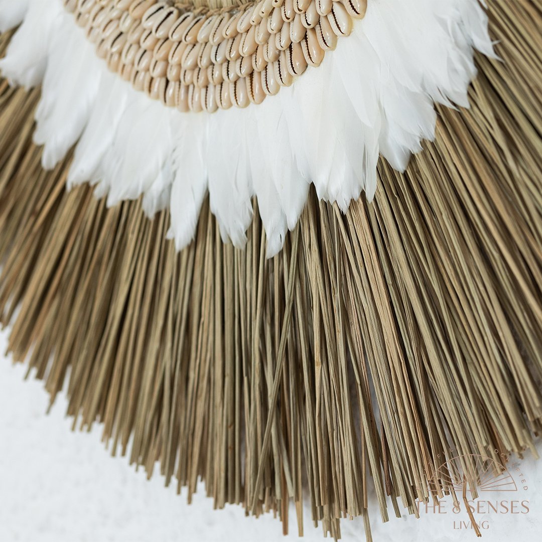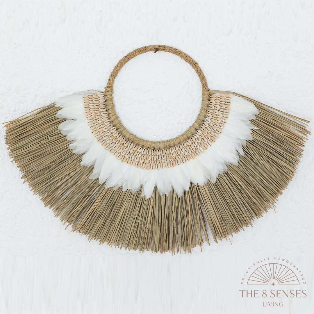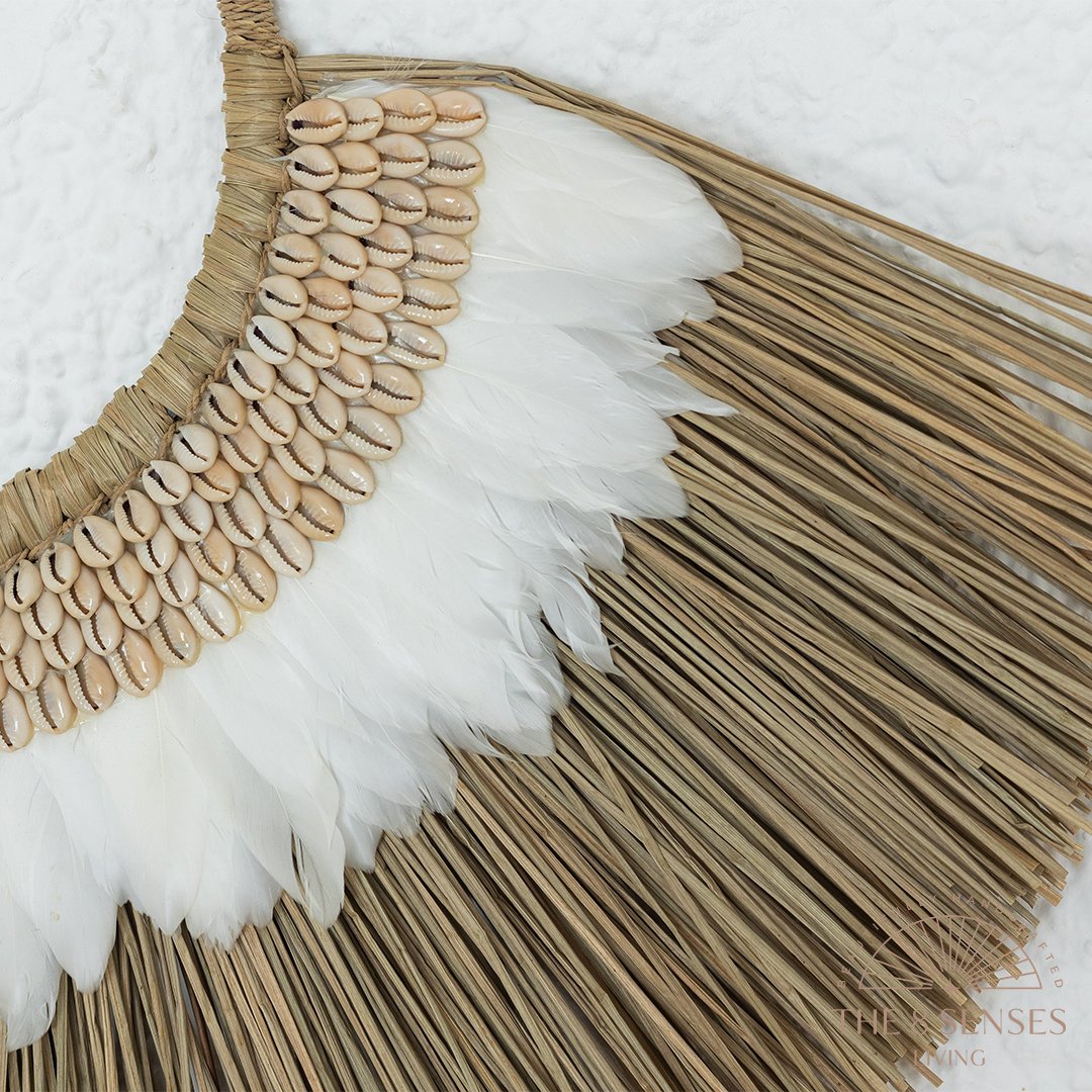 Natural wall hanging made in bohemian design from organic seagrass, adorned with white seashells, and vegan feathers