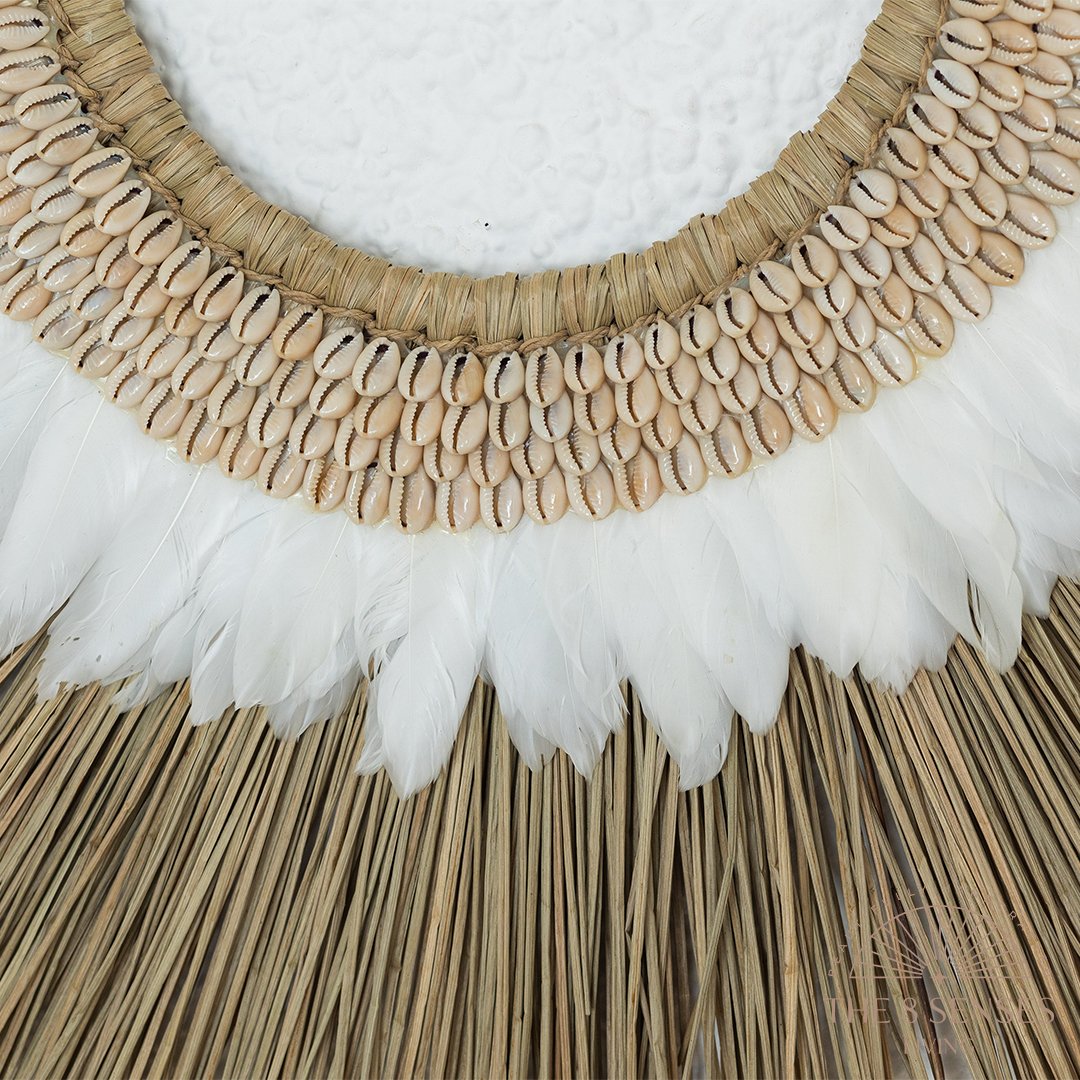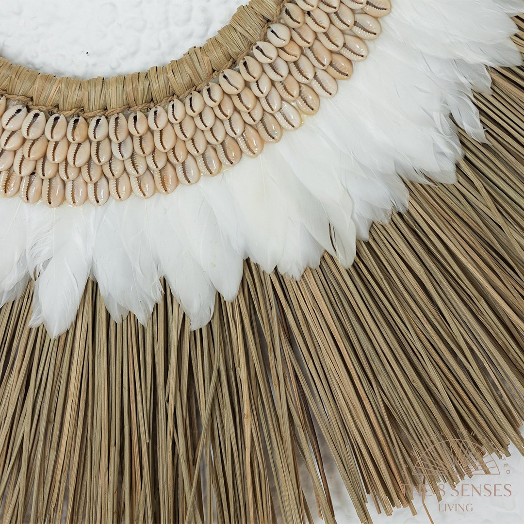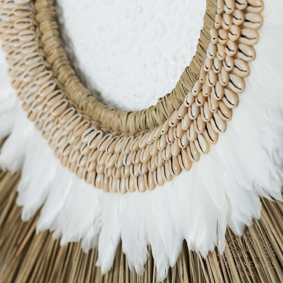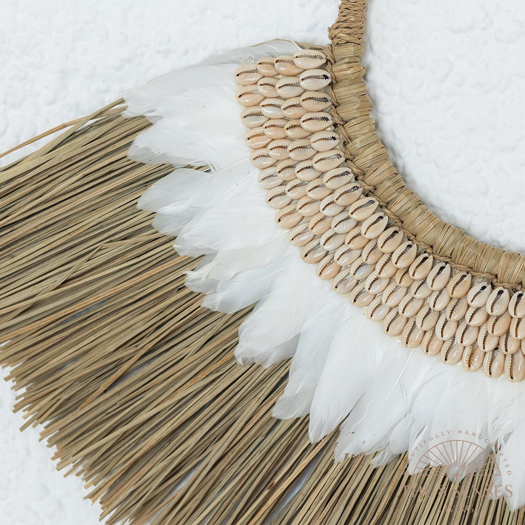 Natural wall hanging made in bohemian design from organic seagrass, adorned with white seashells, and vegan feathers