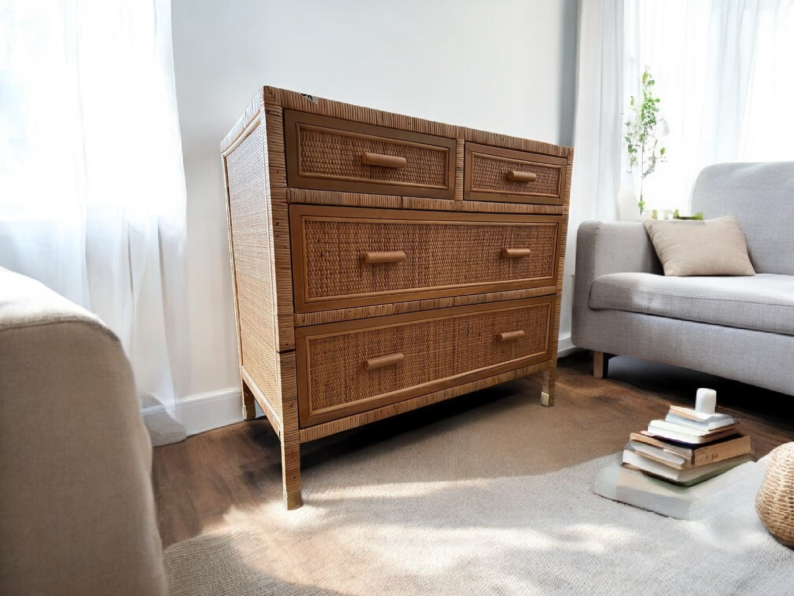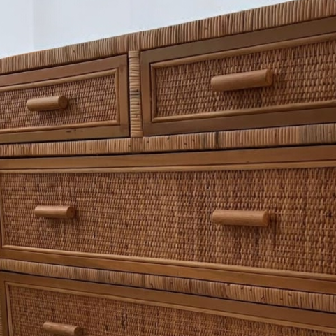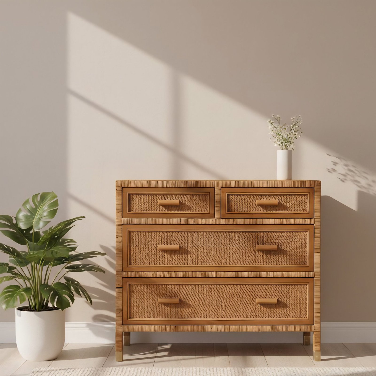 The Sowa Wicker Dresser is a timeless storage piece that blends natural rattan textures with a solid wooden frame. Finished in a soft natural matte tone, it brings warmth, lightness, and artisanal charm to any bedroom or living space.