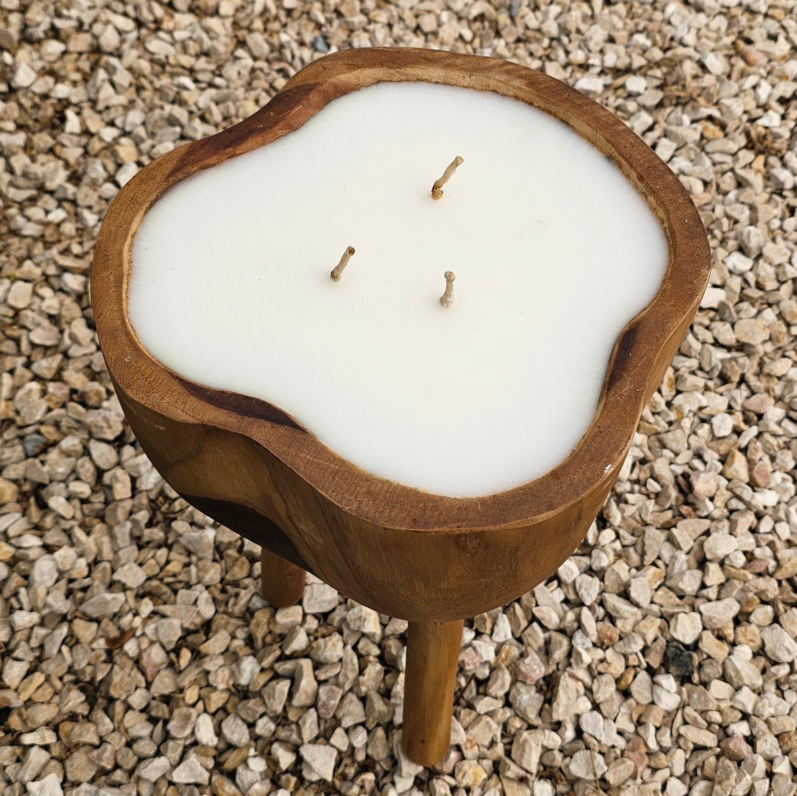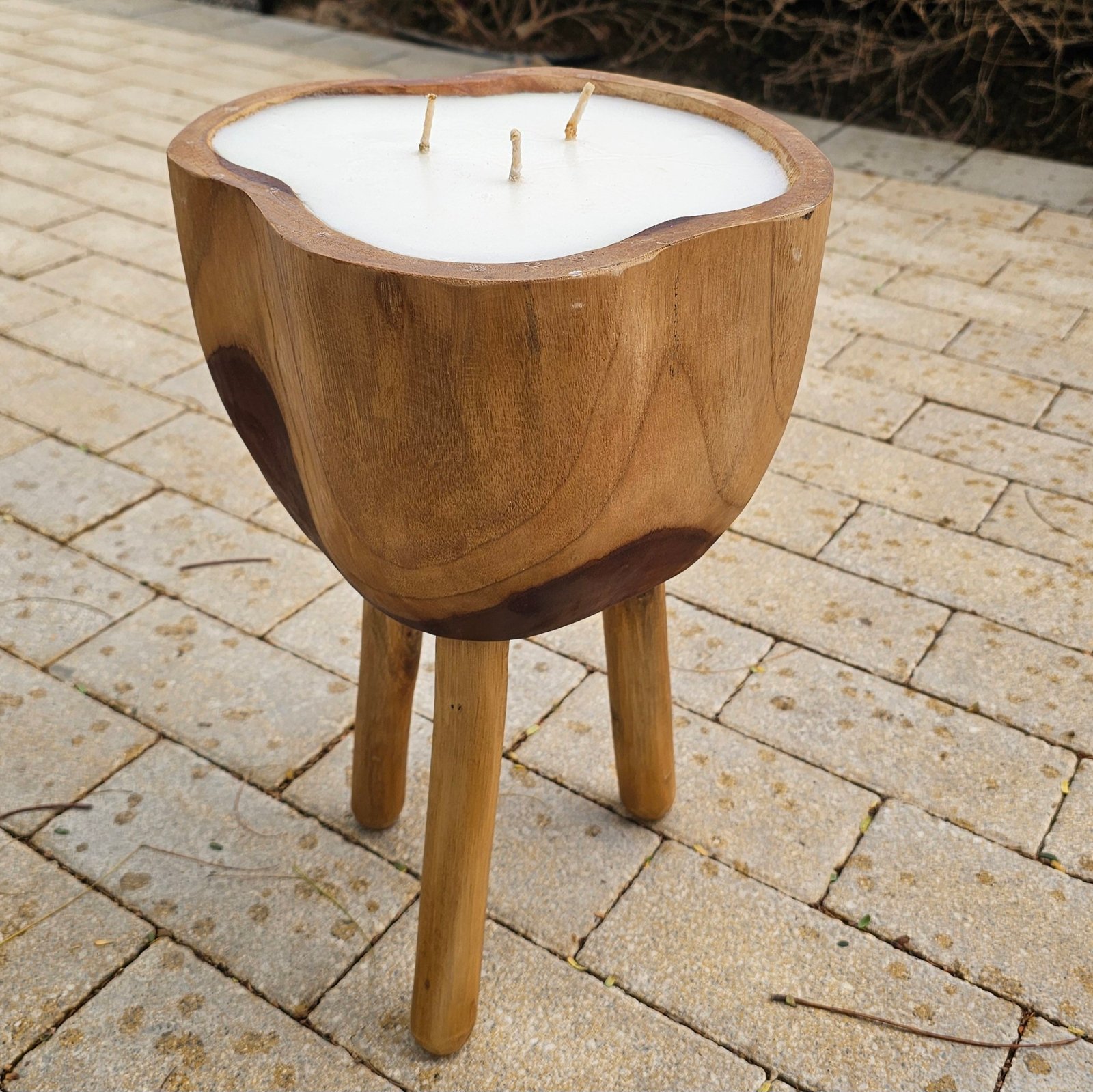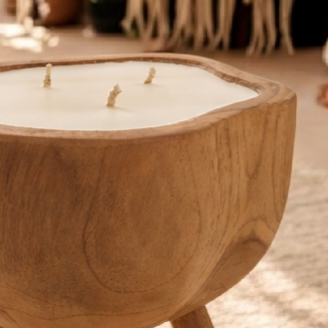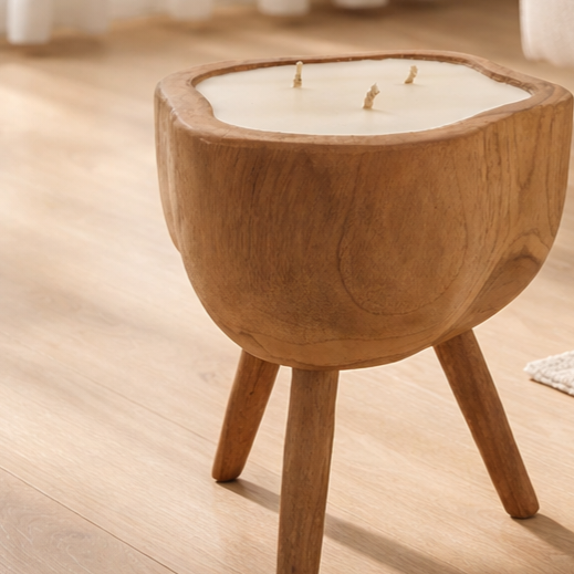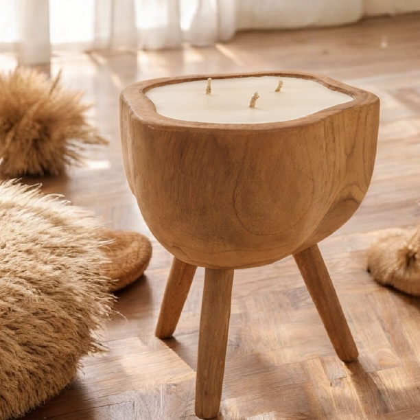 A three-wick candle set inside a natural teak-wood bowl with elegant tripod legs โ a distinctive piece that blends practical use with decorative charm.