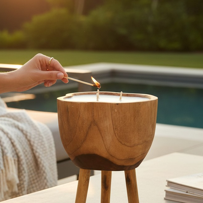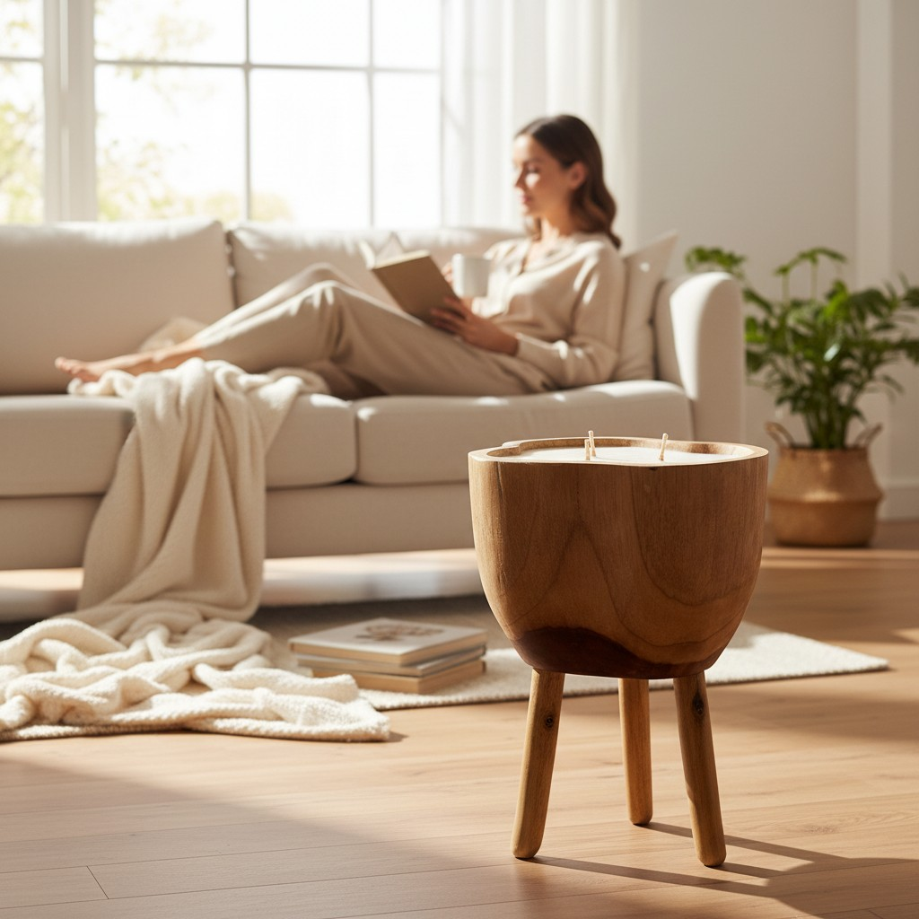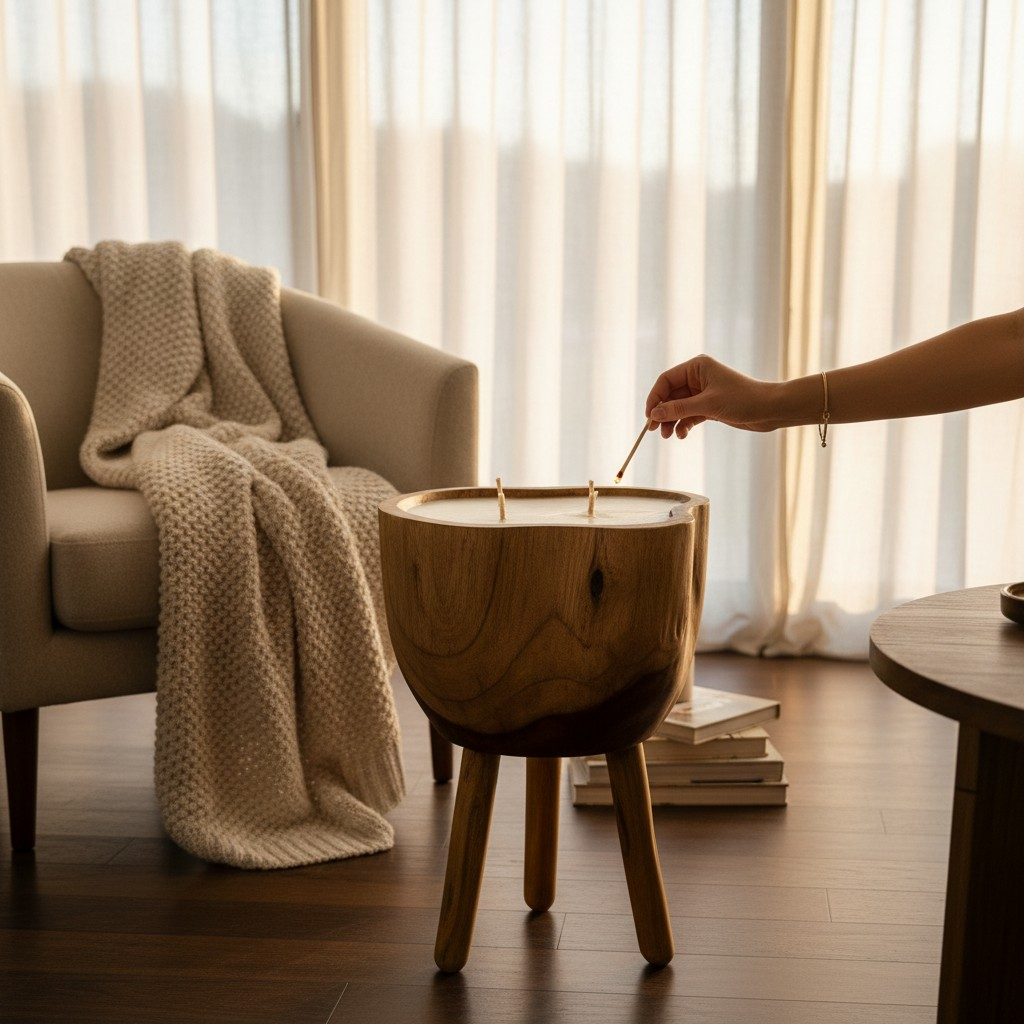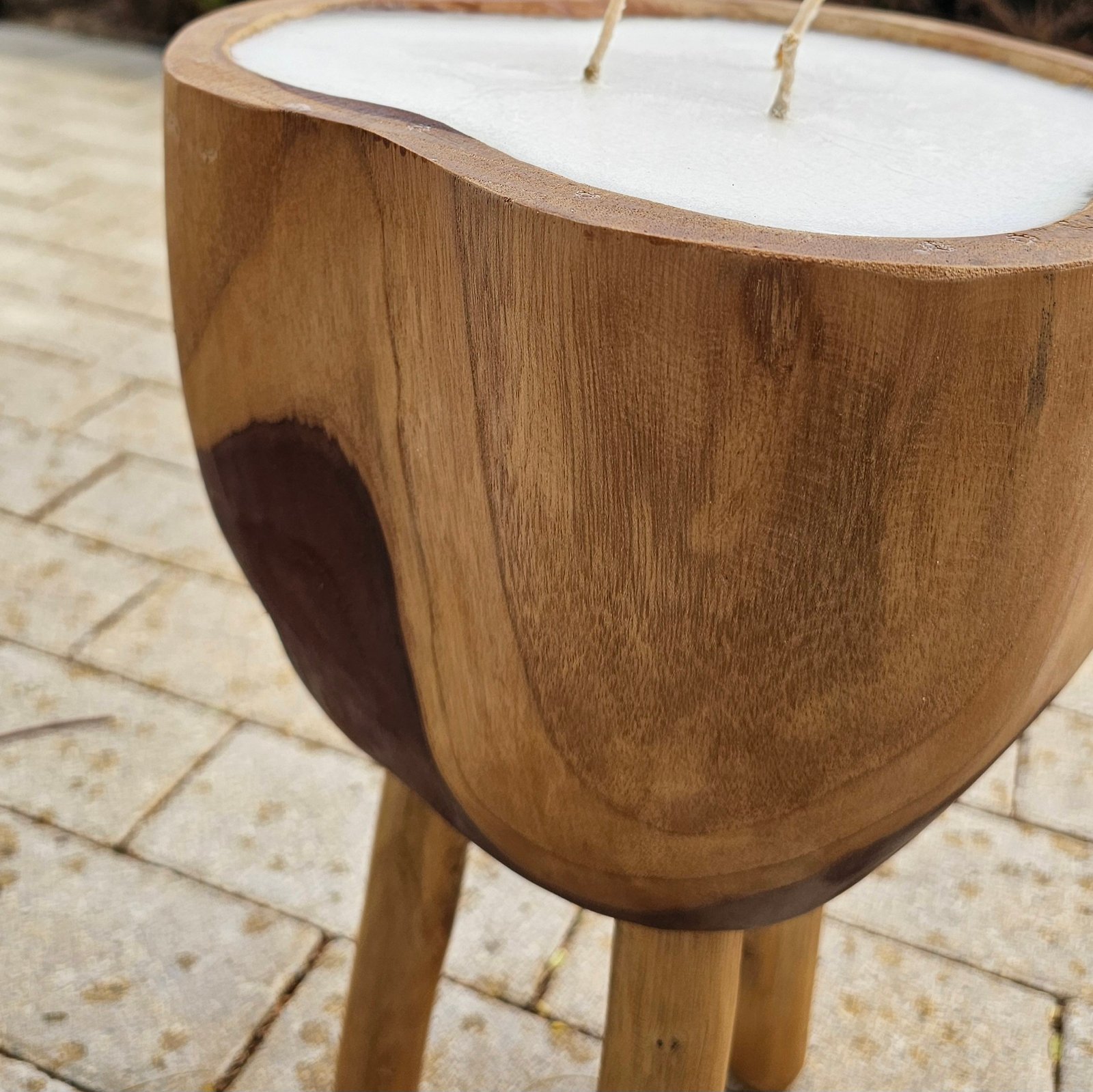 A three-wick candle set inside a natural teak-wood bowl with elegant tripod legs โ a distinctive piece that blends practical use with decorative charm.
