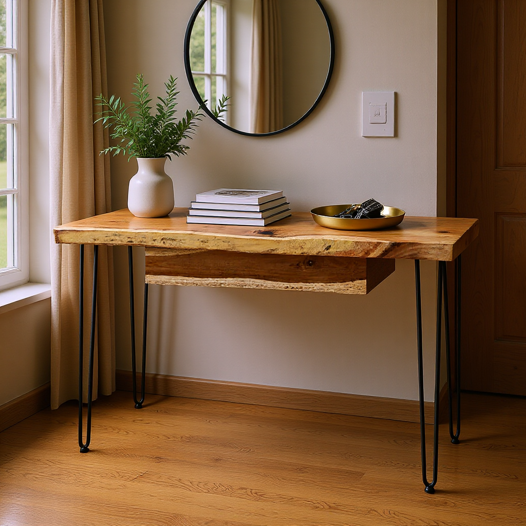 Making a nod to classic mid-century furniture with black hairpin legs, this organic live edge console table is truly one of a kind.