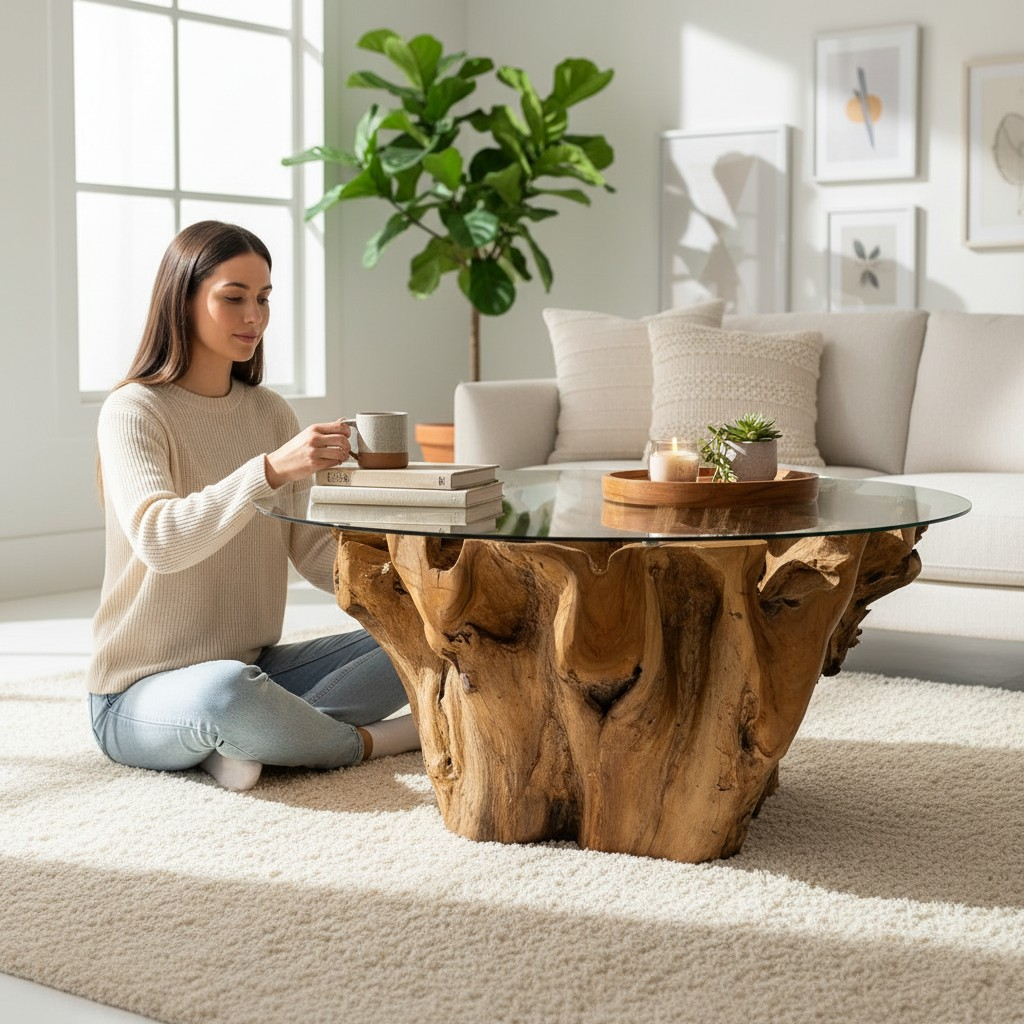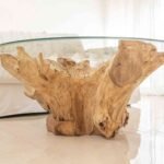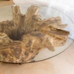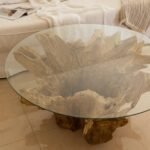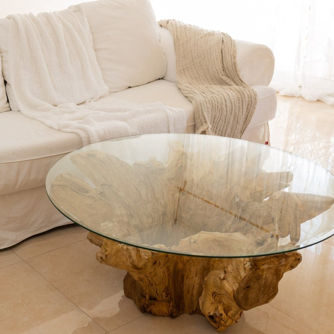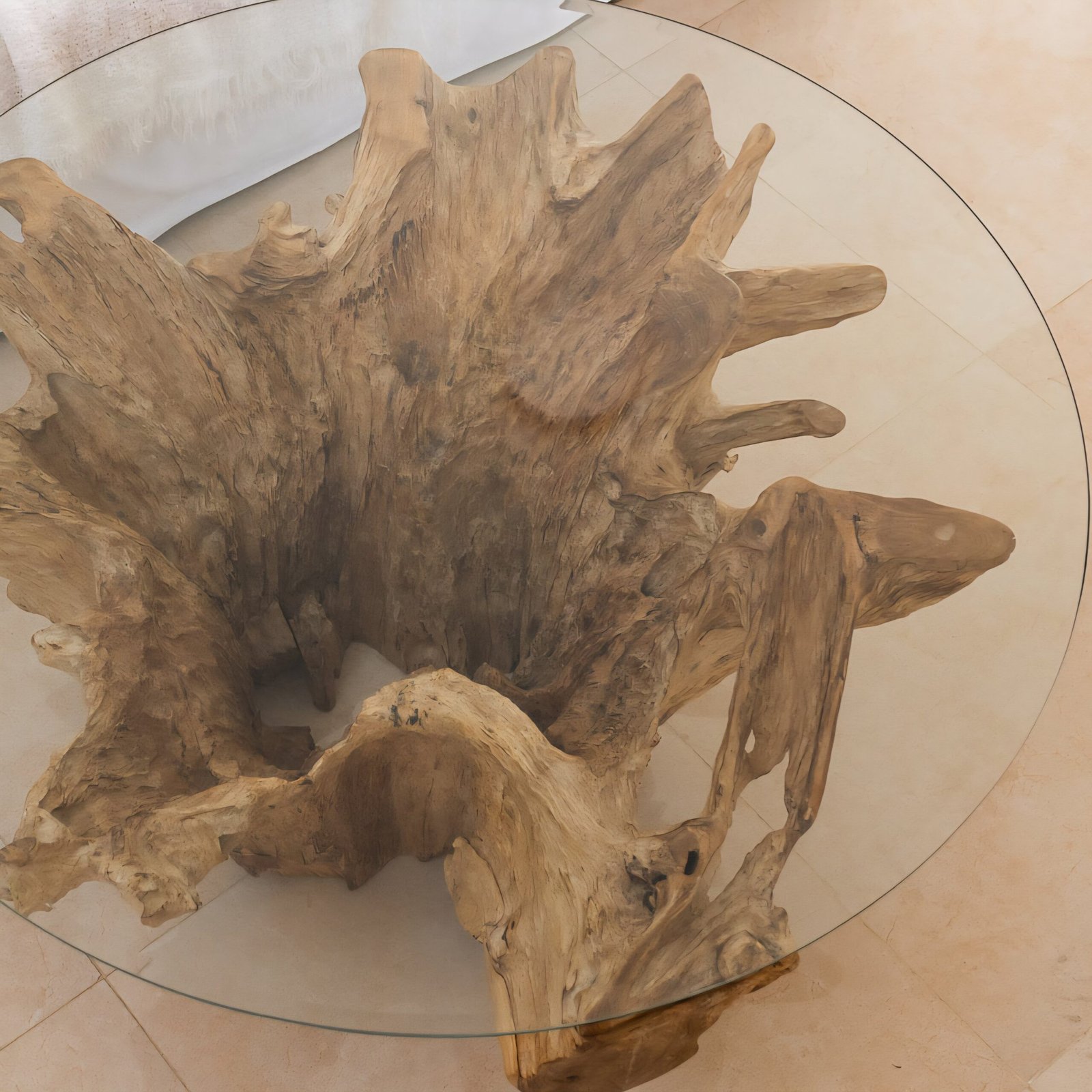 A tempered glass top completes the look. With materials taken directly from nature, each table will differ in shape and form.