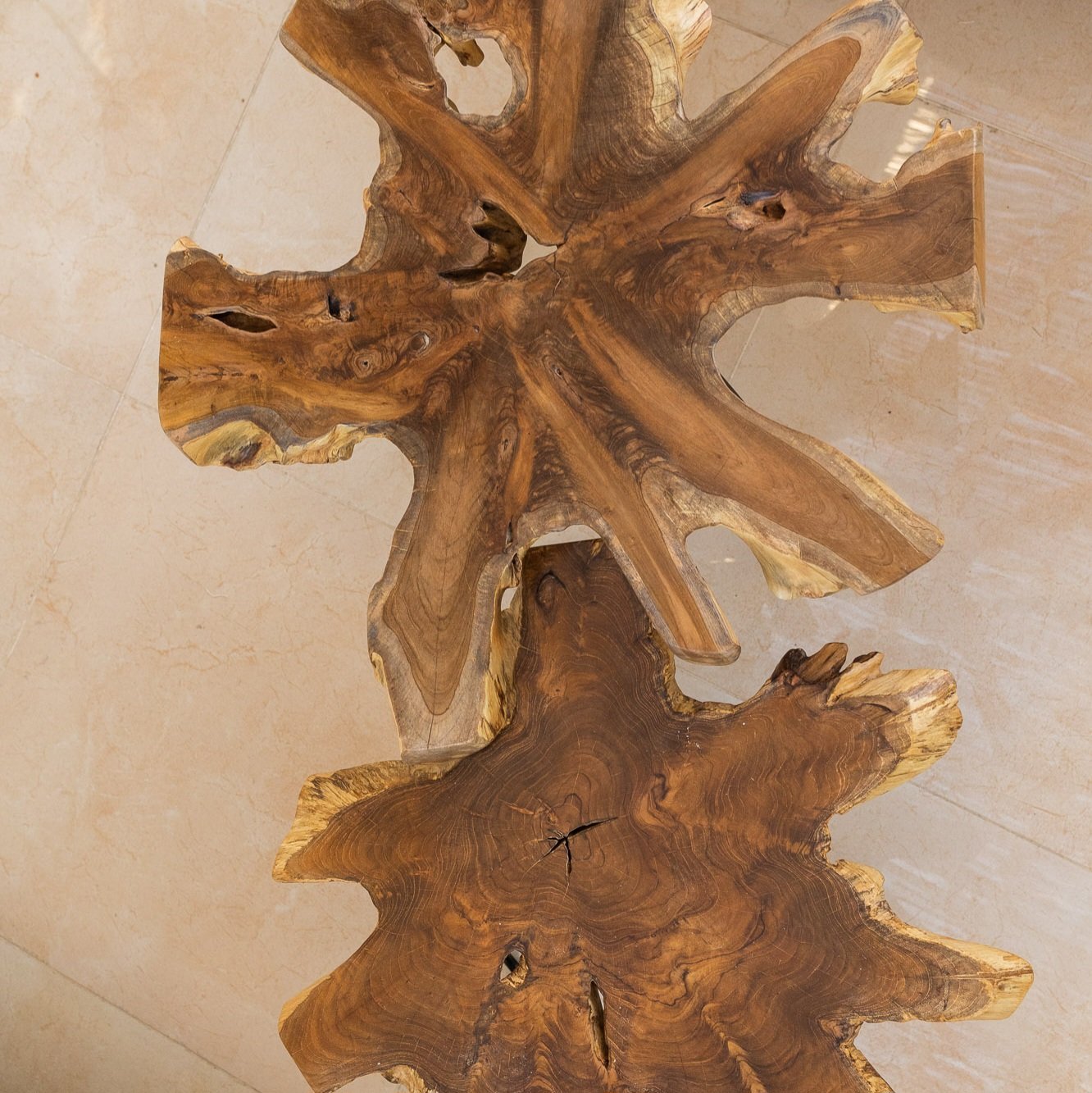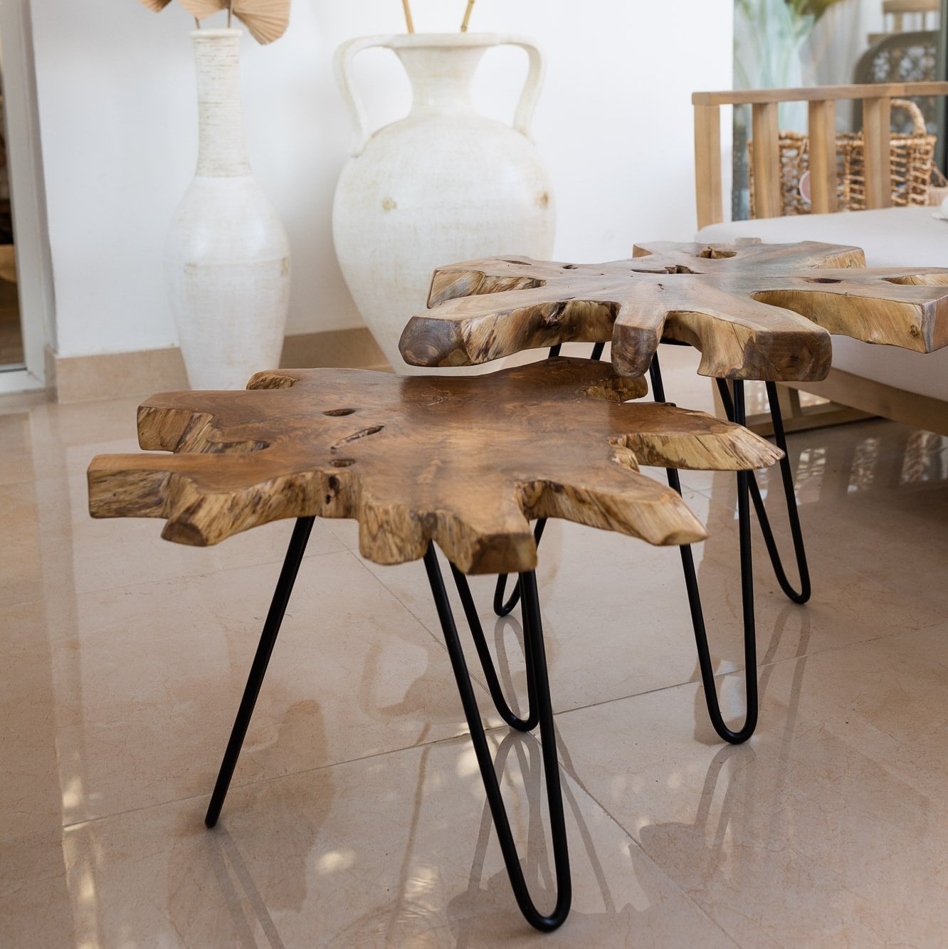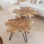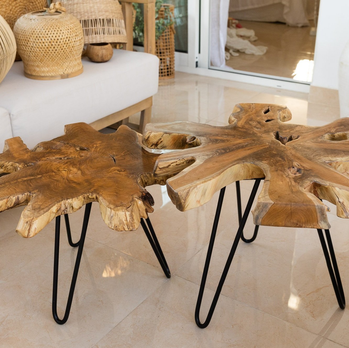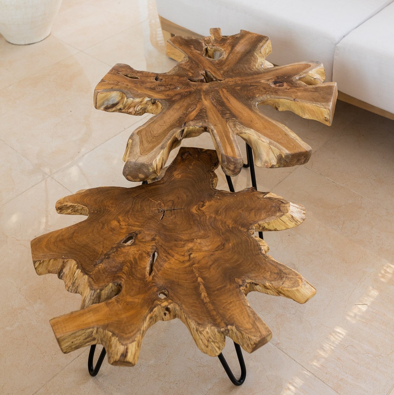 Our truly distinctive coffee table is crafted in Indonesia from a real slice of richly grained teak root with inherent holes, knots, and variations in size and shape. Making a nod to classic mid-century furniture with black hairpin legs, this organic coffee table is truly one of a kind.