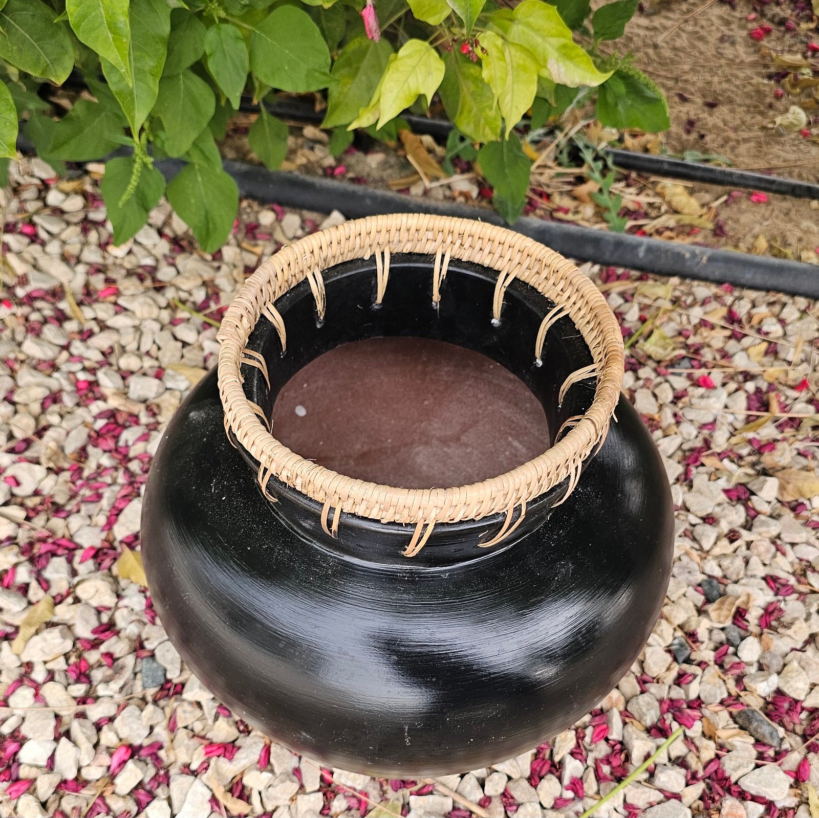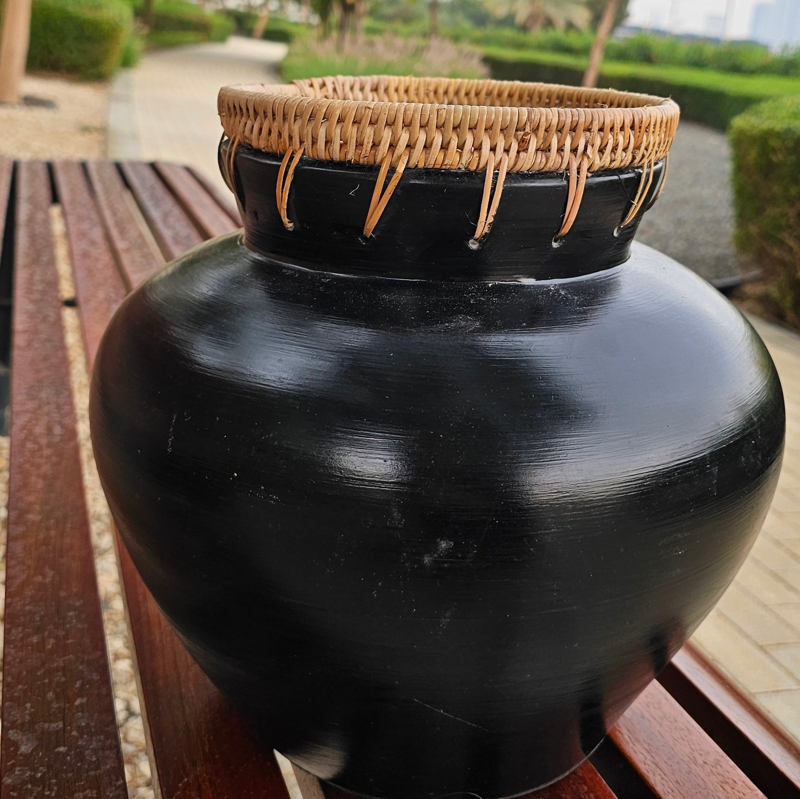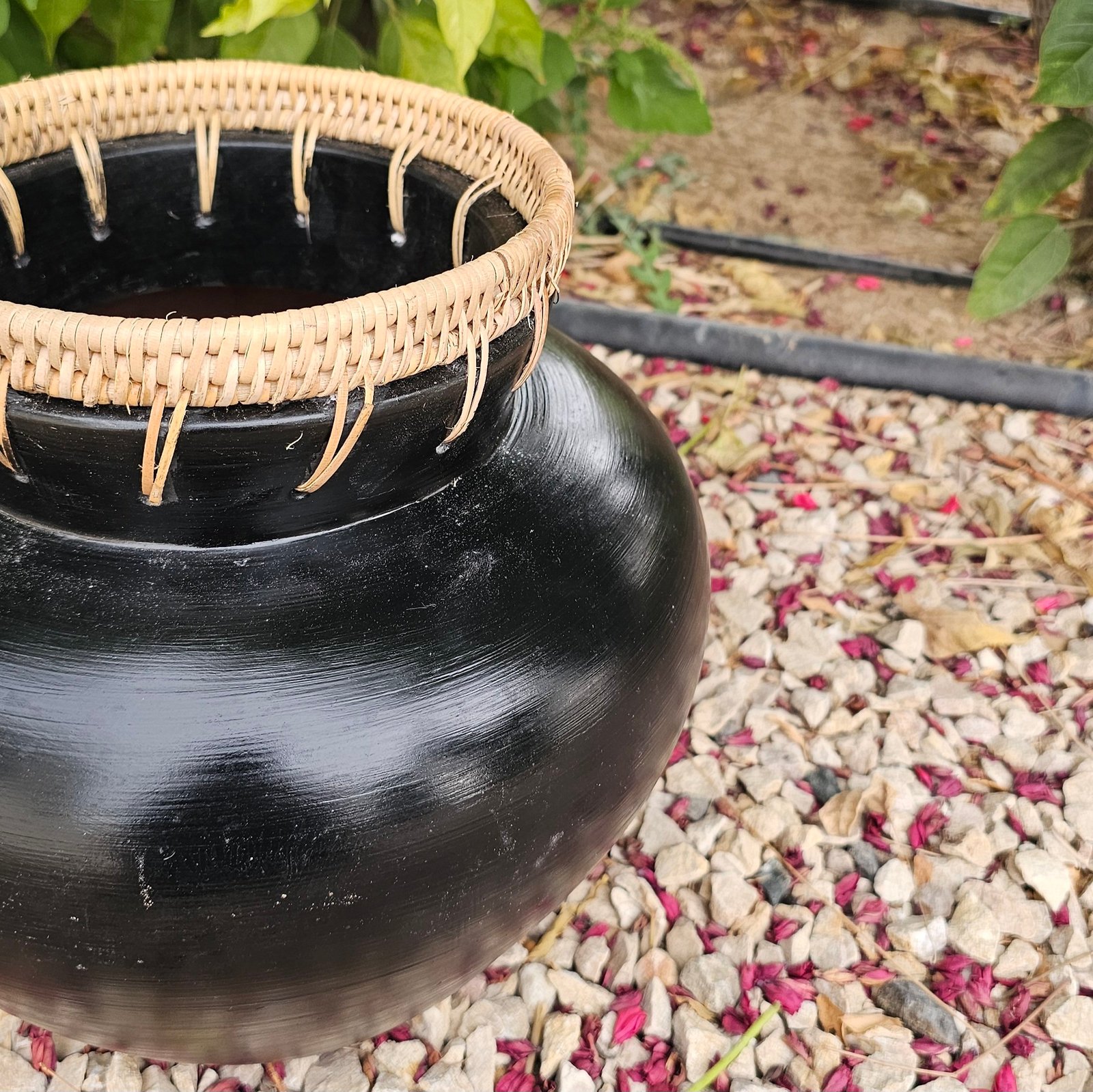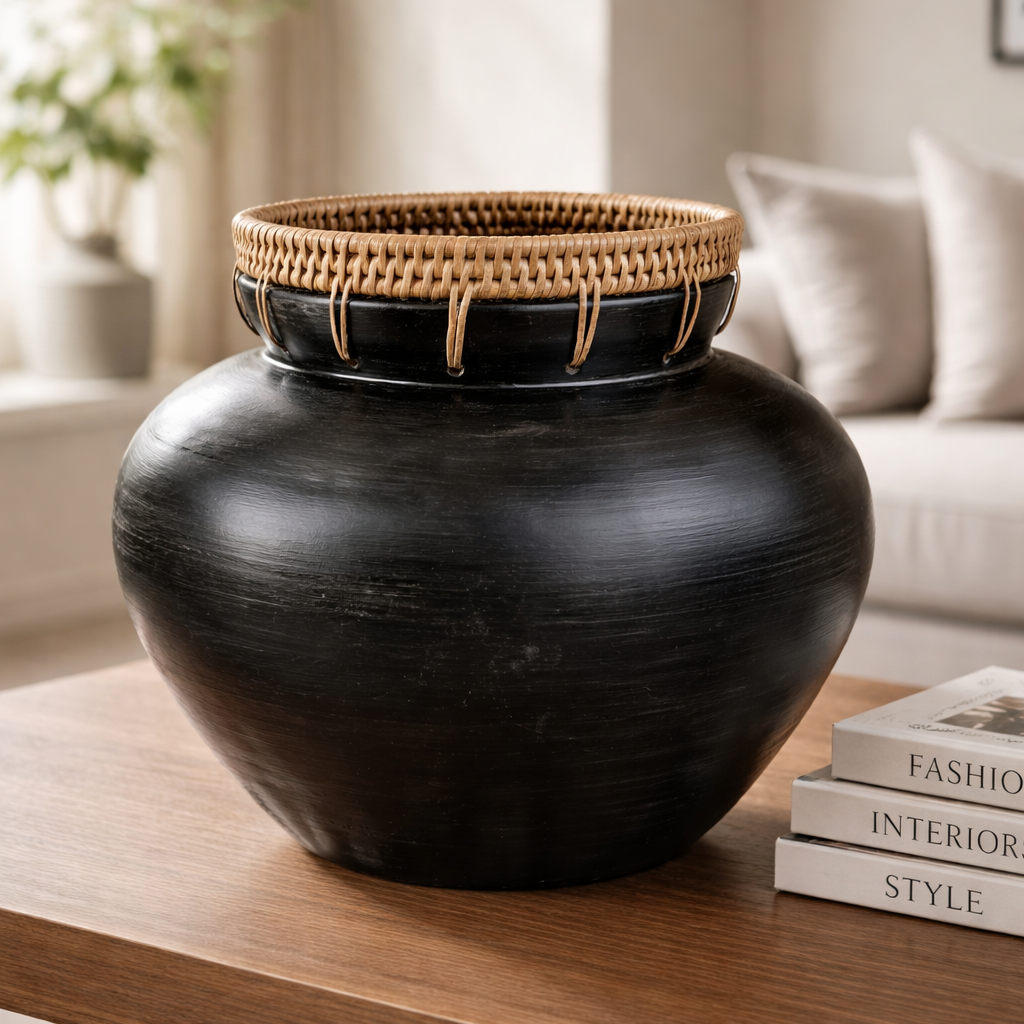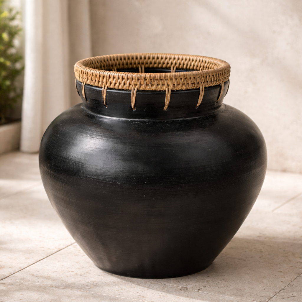 Viola Vase is a striking decorative piece that beautifully combines the raw warmth of terracotta with the organic elegance of handwoven rattan. The contrast between smooth clay and textured weave creates a refined yet earthy aesthetic, adding depth and character to any space.