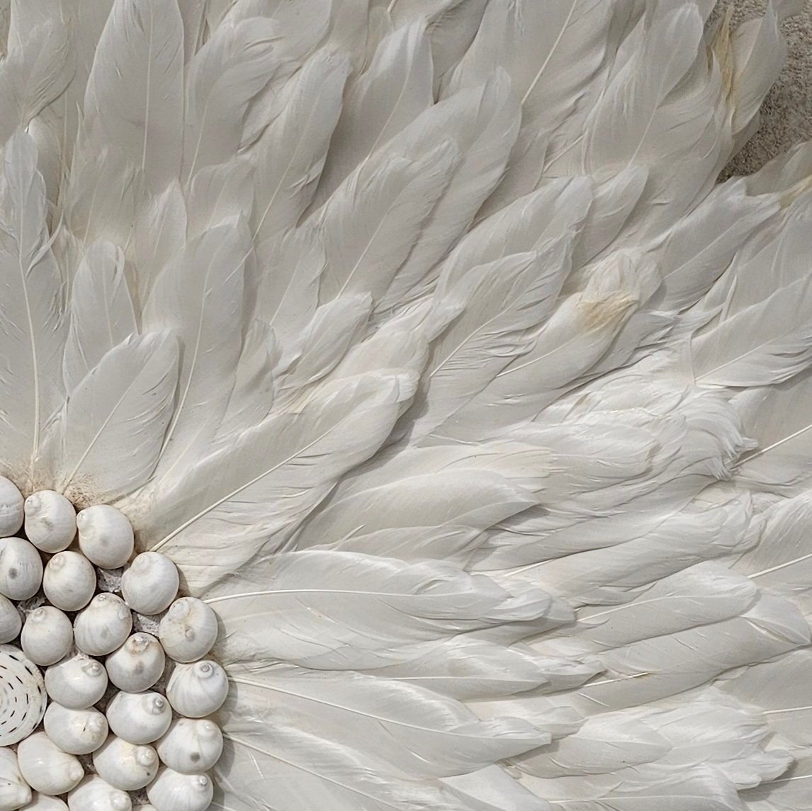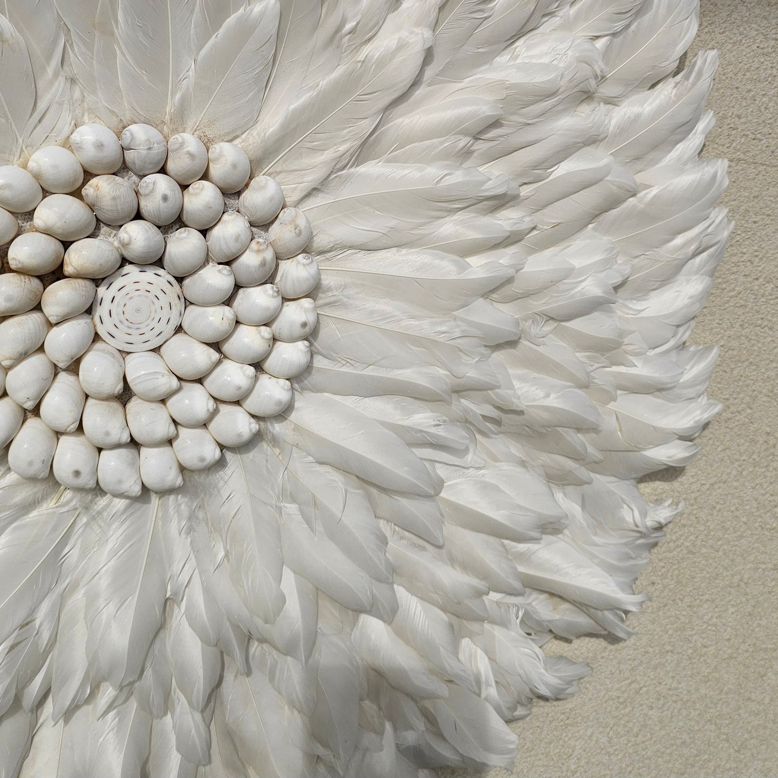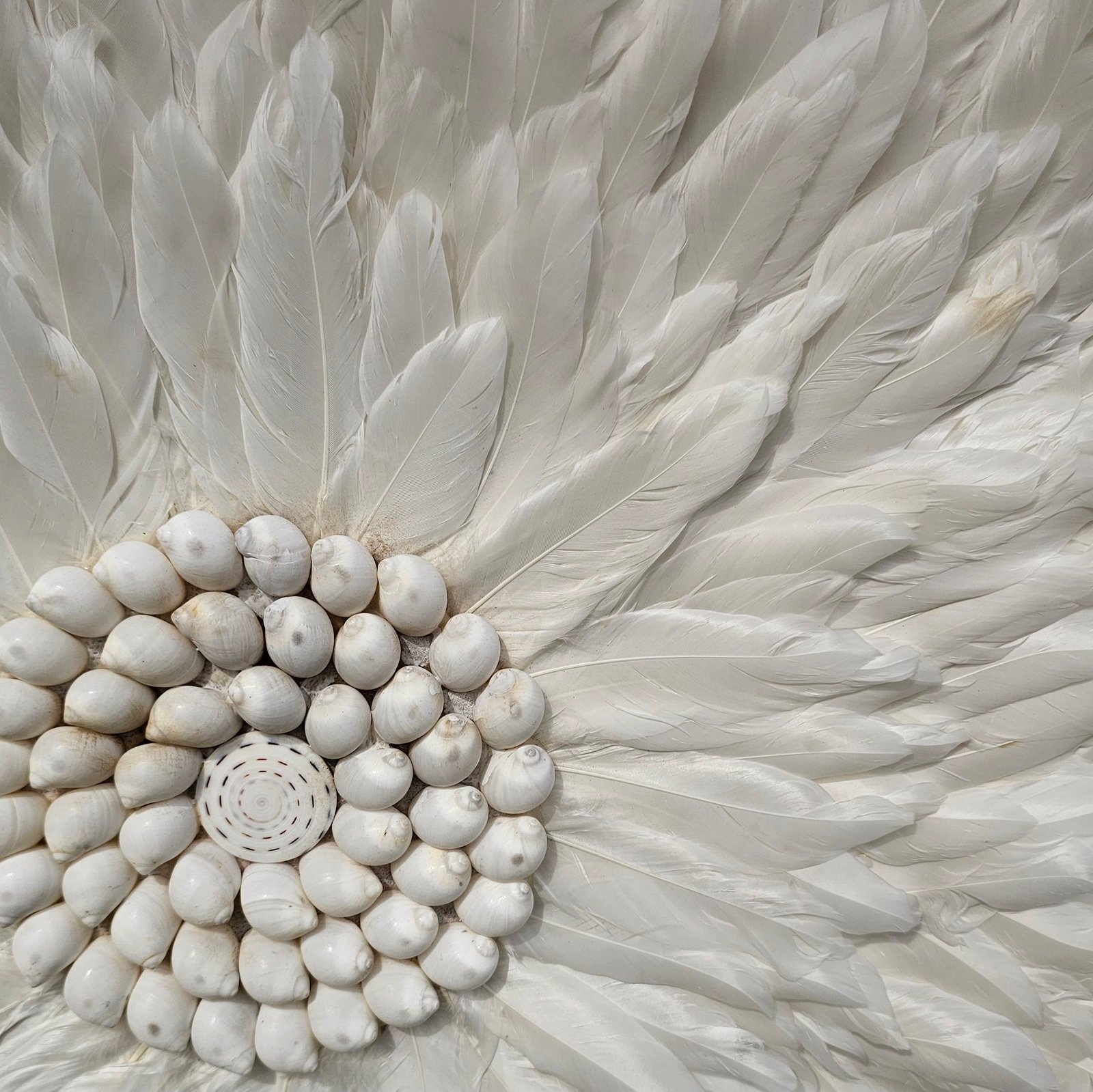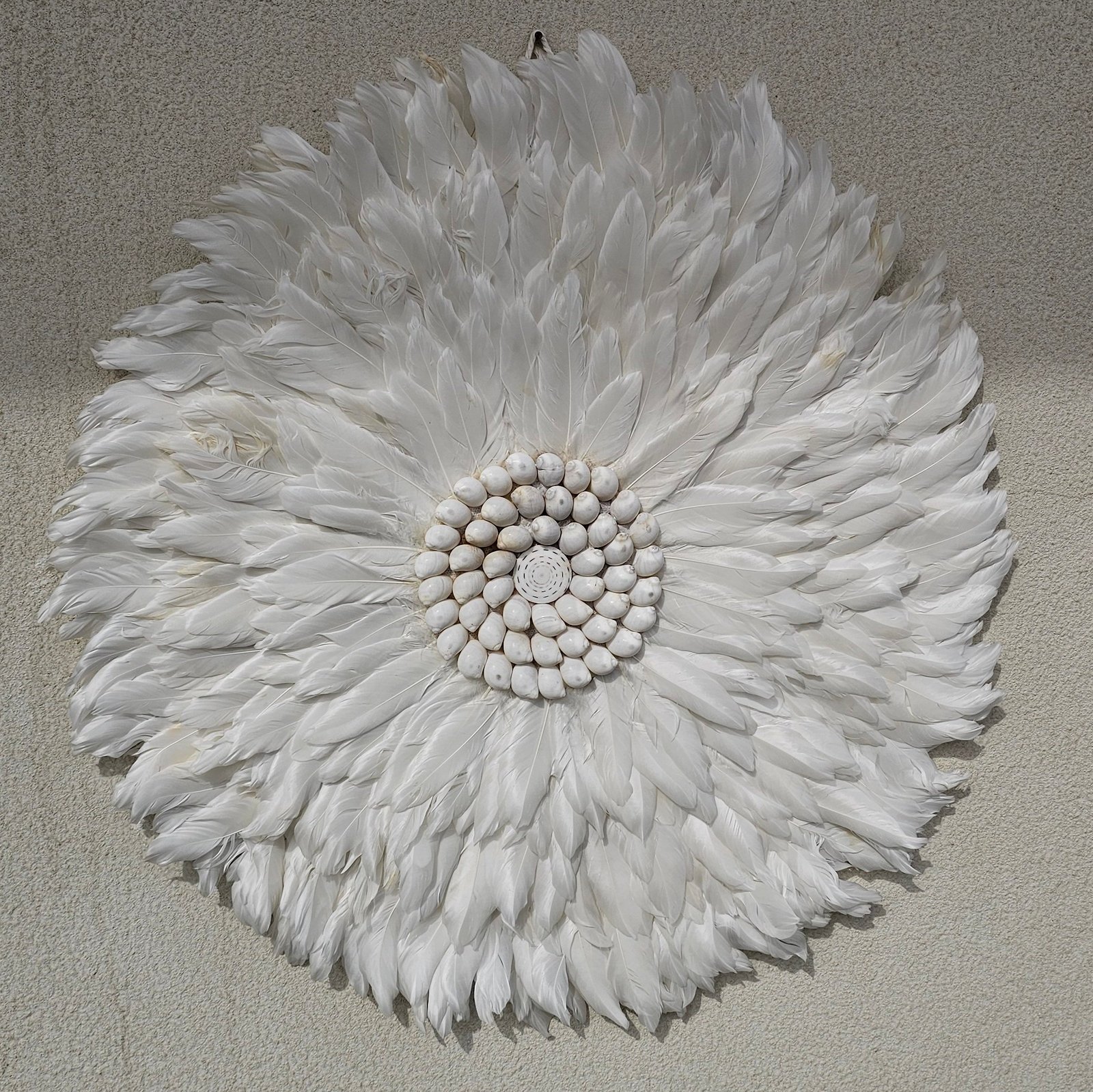 A timeless piece that embodies understated luxury. The soft white feathers reflect light beautifully, creating an airy and serene ambiance, while the shell center adds an earthy, artisanal touch.
