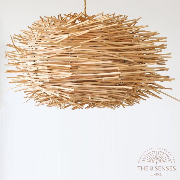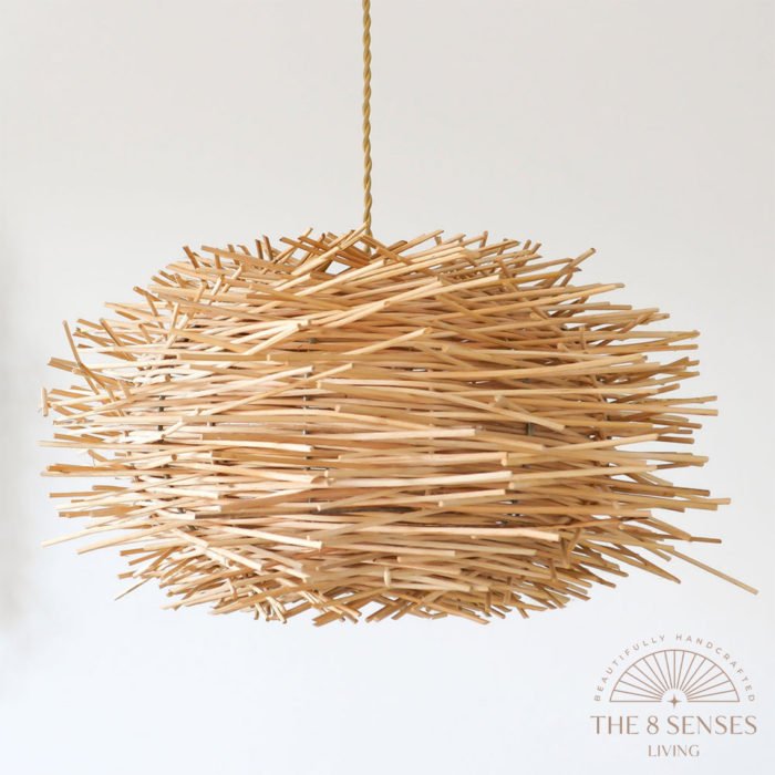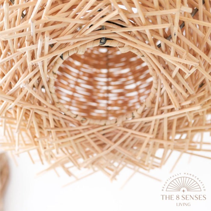 Handcrafted by our talented artisans of natural wicker, this textured pendant lamp is woven into a round bird’s nest shape that wonderfully filters light.
