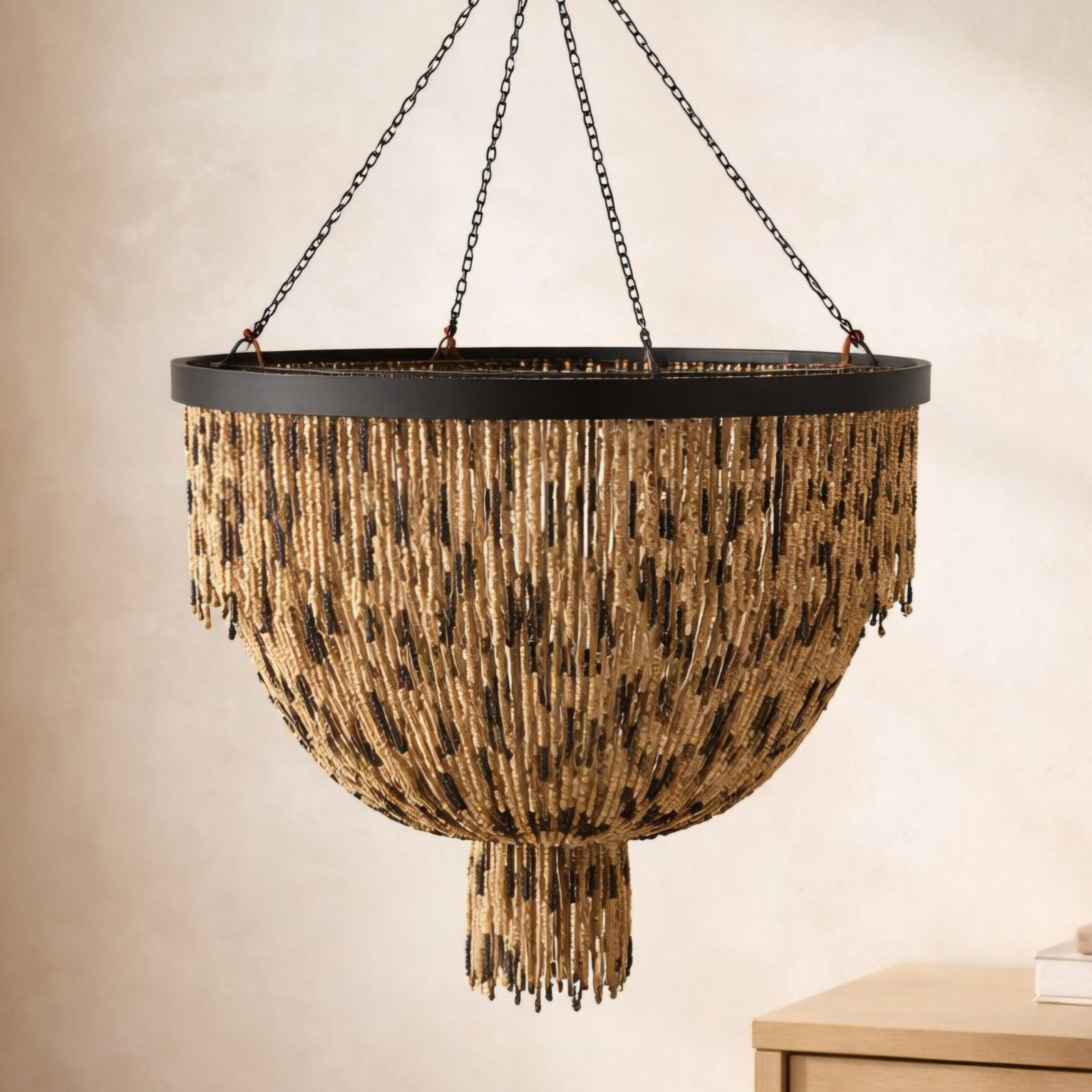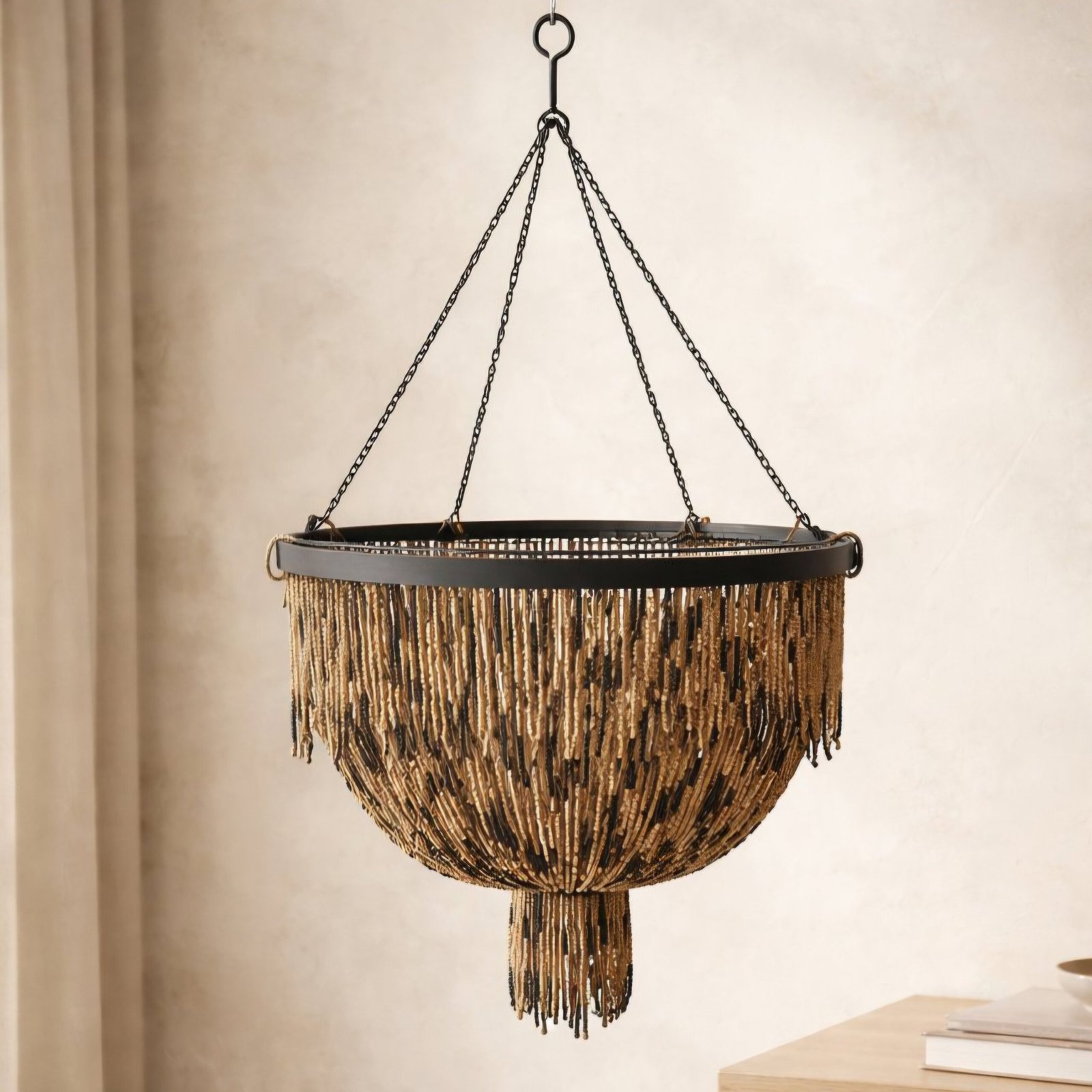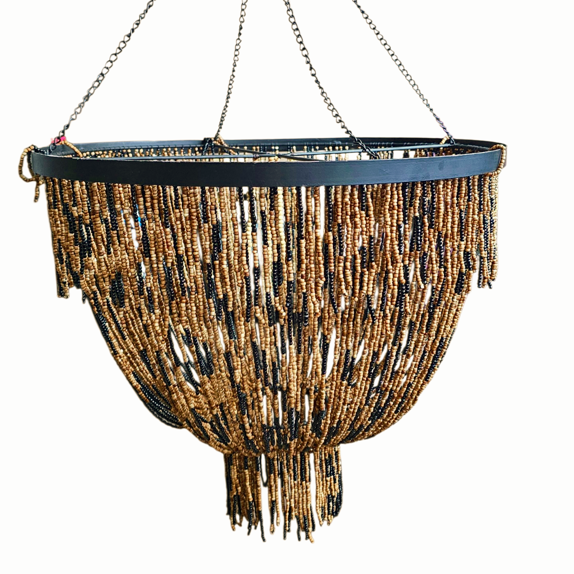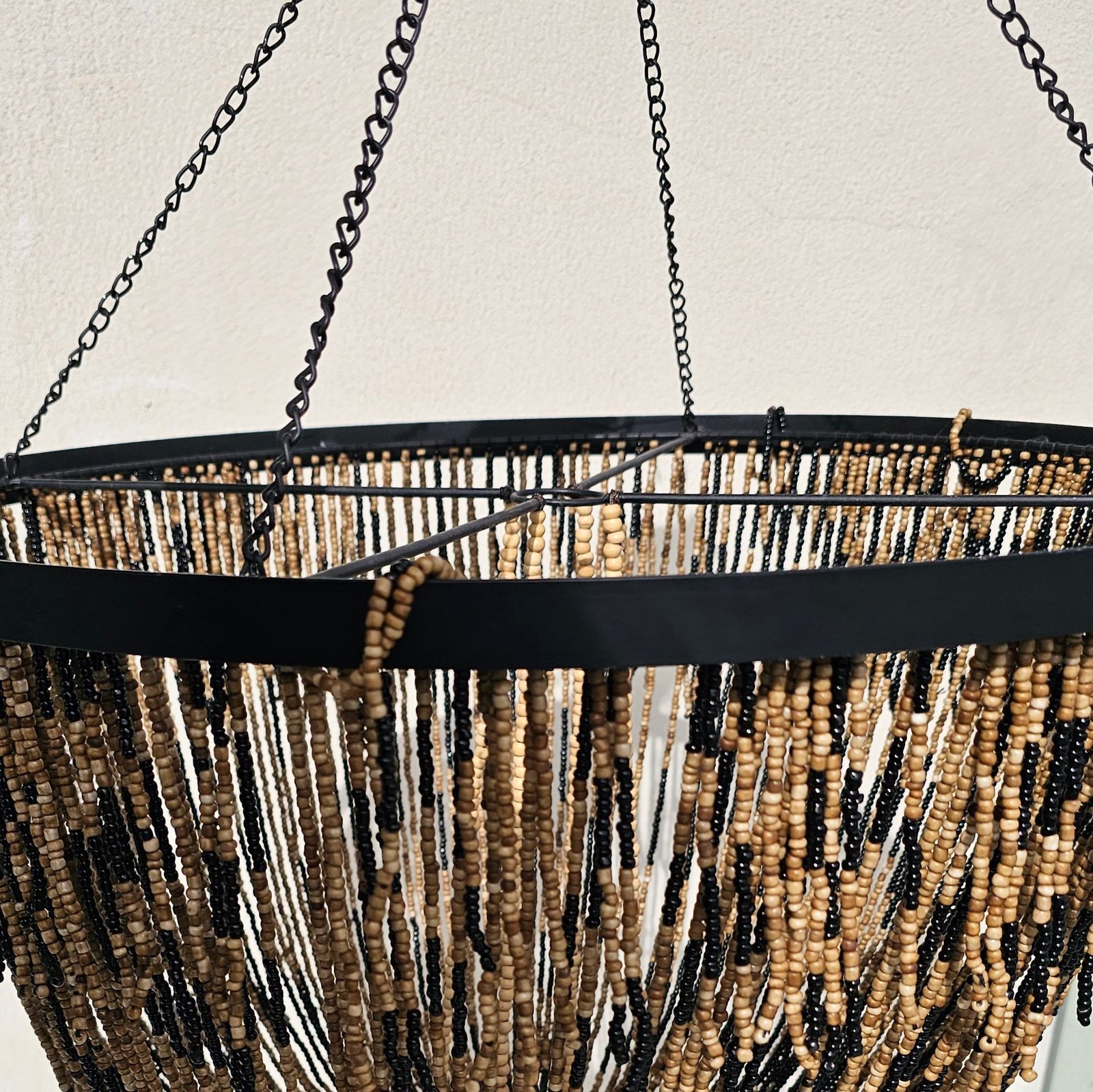 Swags of hand-strung wooden beads are the wood beaded Chandelier’s unexpected twists. Graceful and classic in form, yet its black and beige wood tones skew coastal-Bohemian.