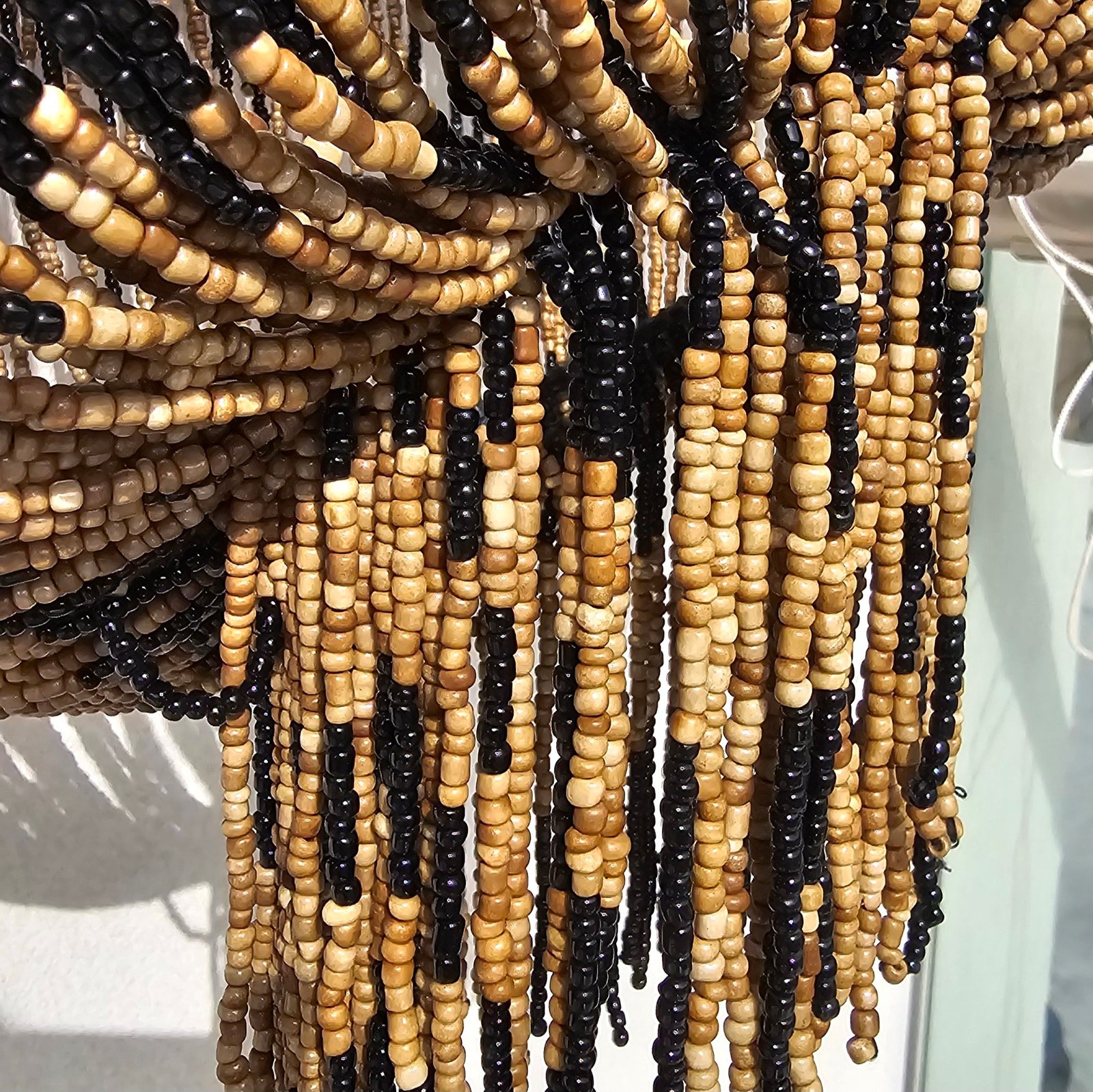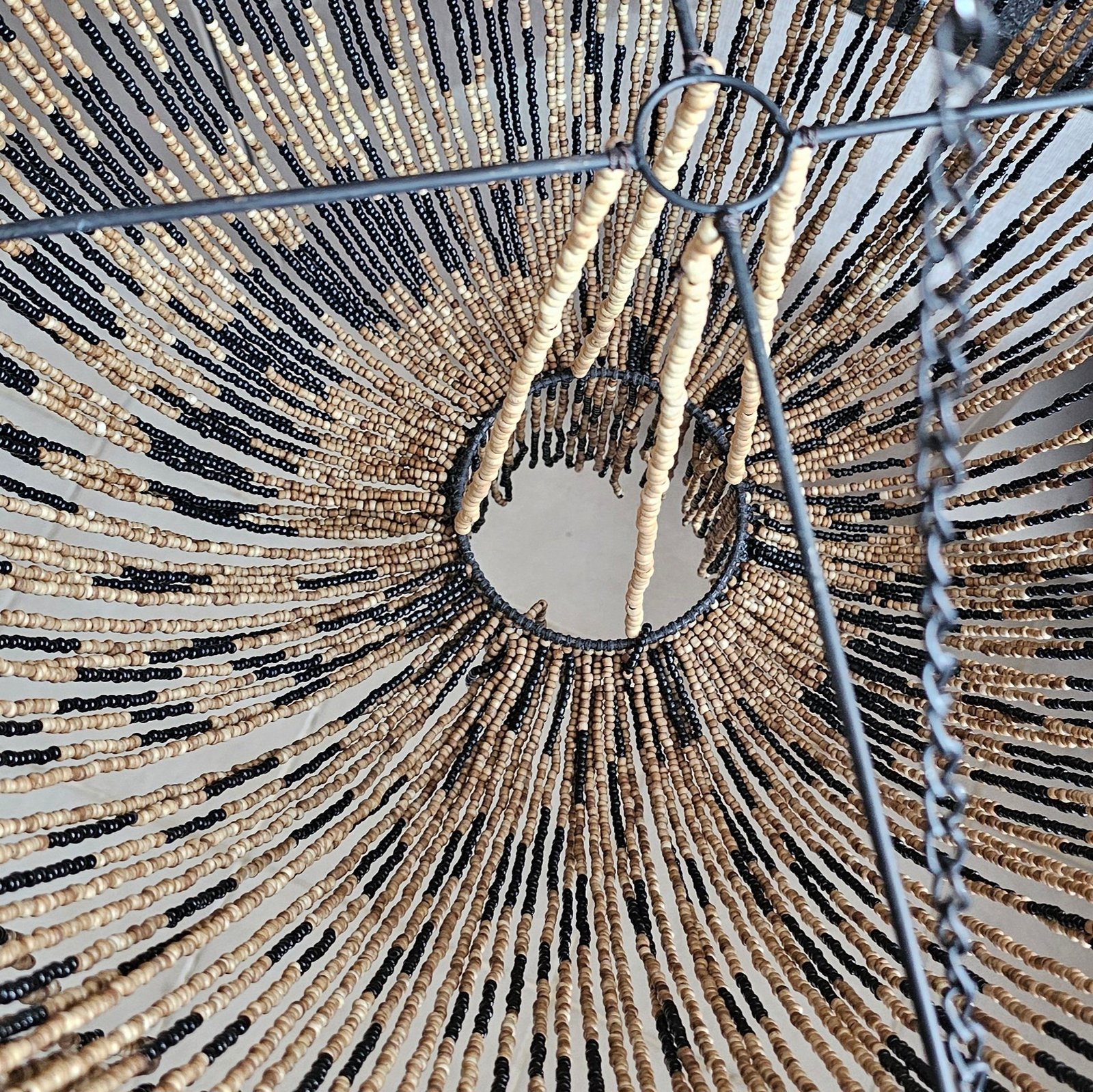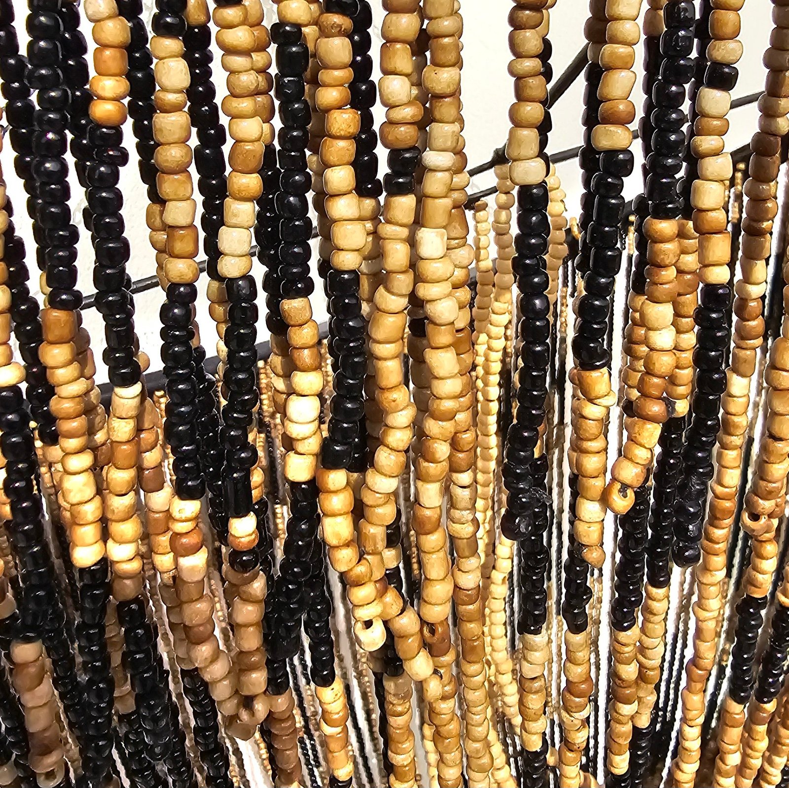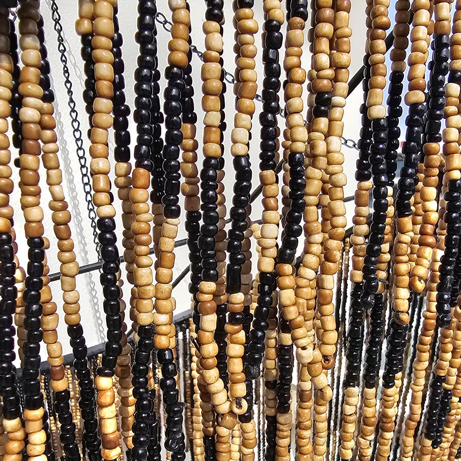 Swags of hand-strung wooden beads are the wood beaded Chandelier’s unexpected twists. Graceful and classic in form, yet its black and beige wood tones skew coastal-Bohemian.