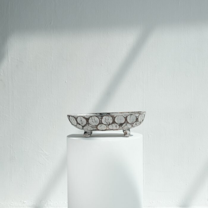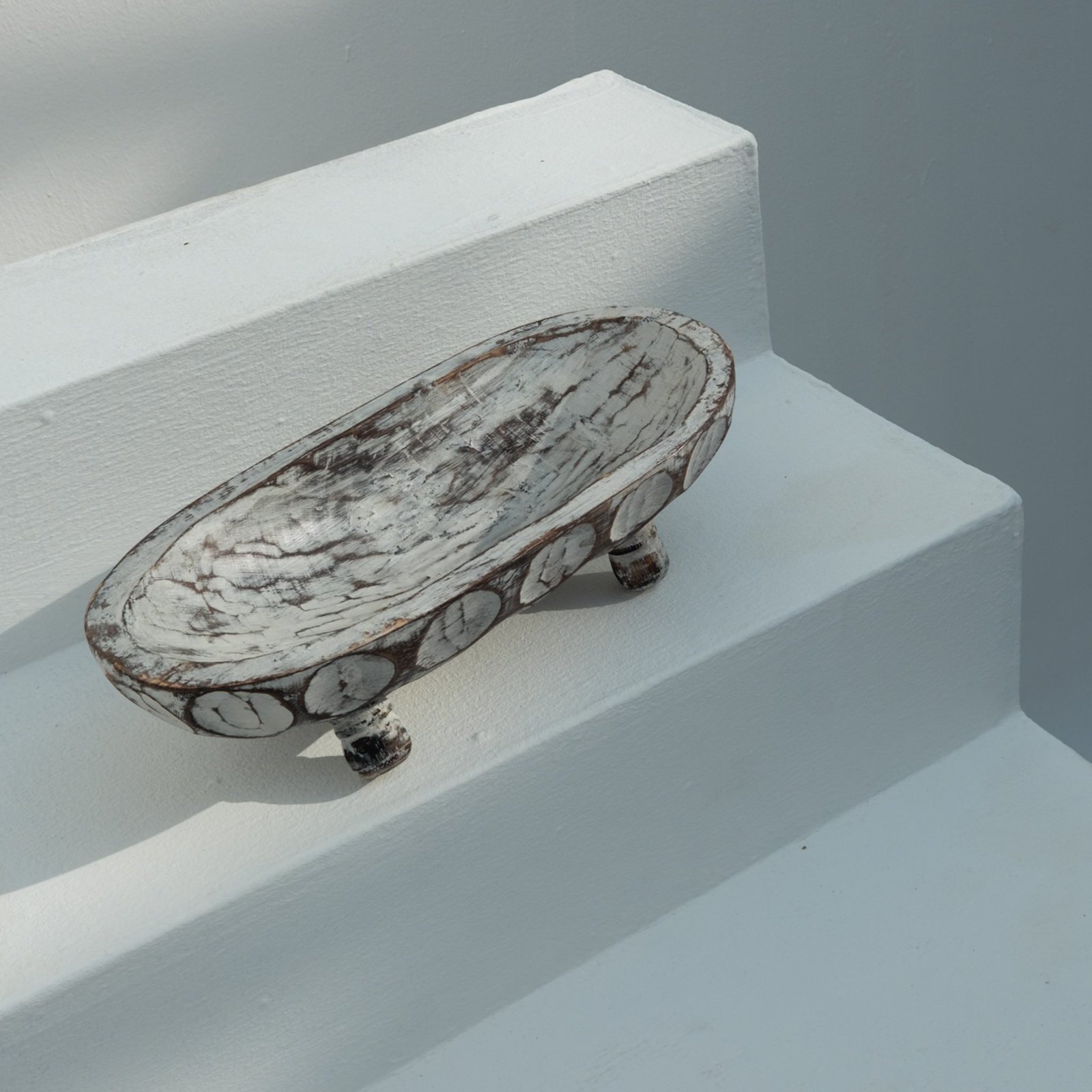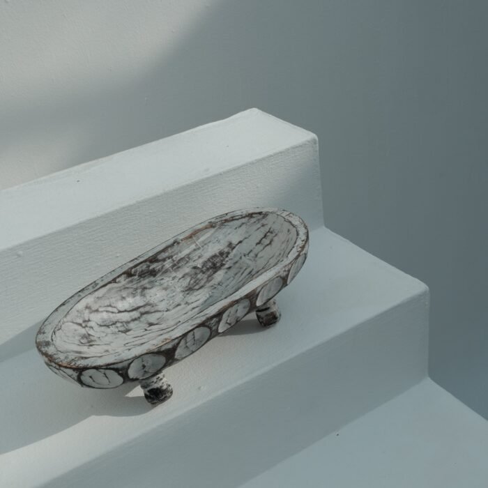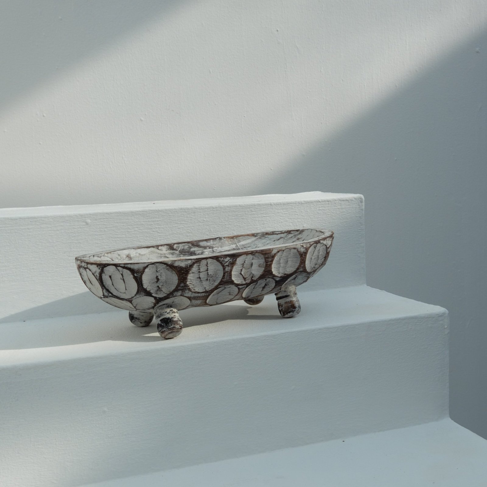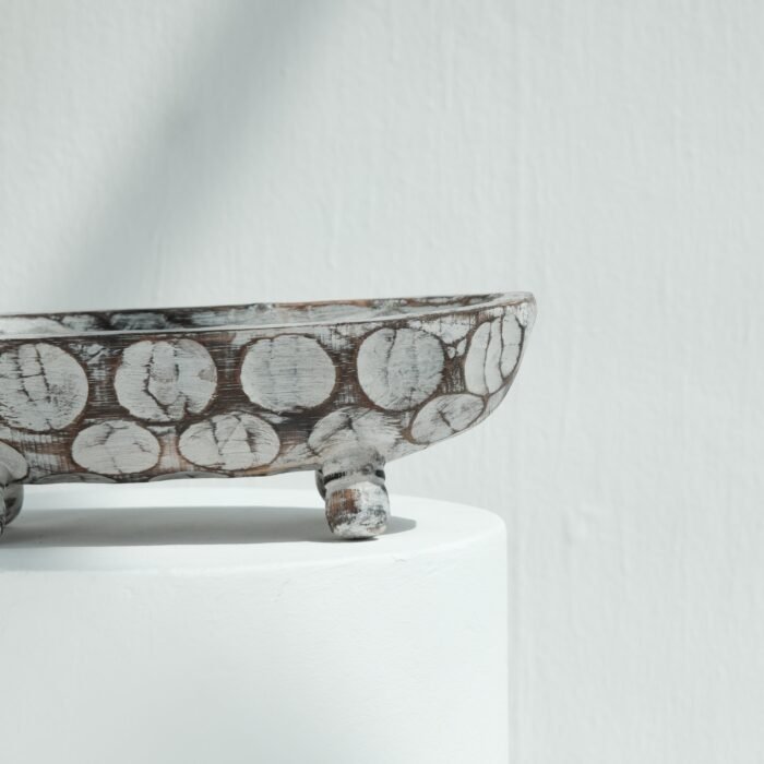 Bring timeless craftsmanship into your home with this exquisite hand-carved wooden tray. Each piece is skillfully crafted by Balinese artisans, showcasing delicate detailing and a soft whitewash finish that highlights the natural grain of the wood.